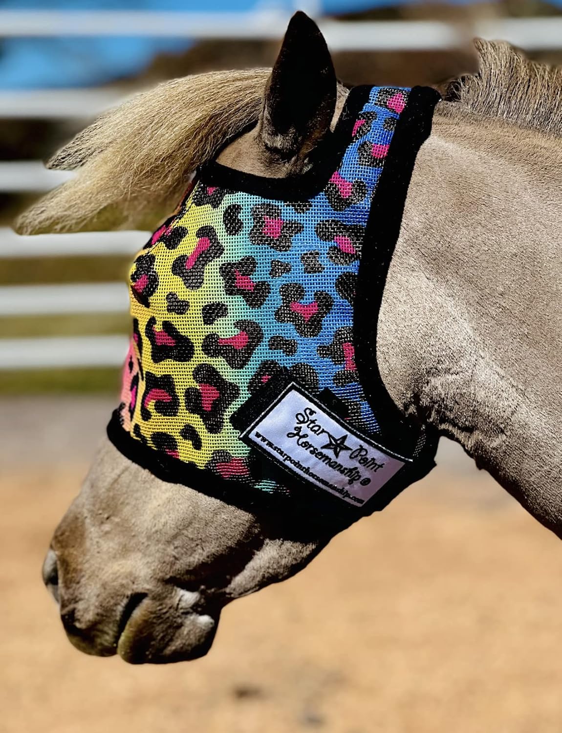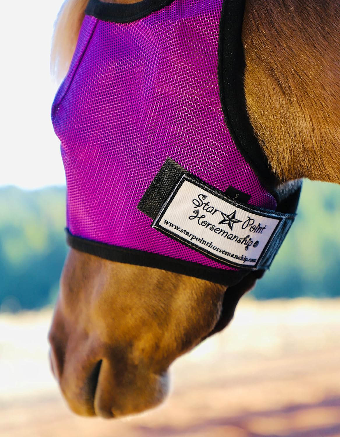 Introducing Star Point Horsemanship Mini & Pony Fly Masks, designed for effortless fitting on your Mini and Pony. With a cozy sherpa lining available in Royal Blue, Pink, or Purple, and secured with heavy-duty velcro, these masks come in six sizes tailored to fit your Mini, Pony, or Mini Donkey flawlessly. Made in the USA, our exclusive size options ensure the perfect fit for your equine companion. SIZE CHART: Medium fits 34-38" Mini, Large fits 39-45" Pony, XL fits 45-52" Pony.