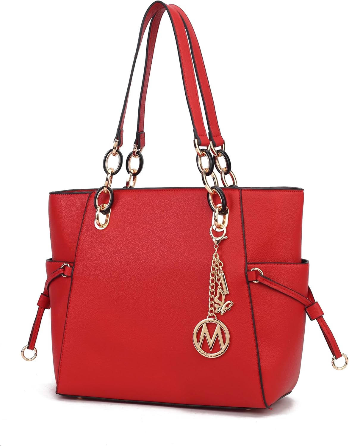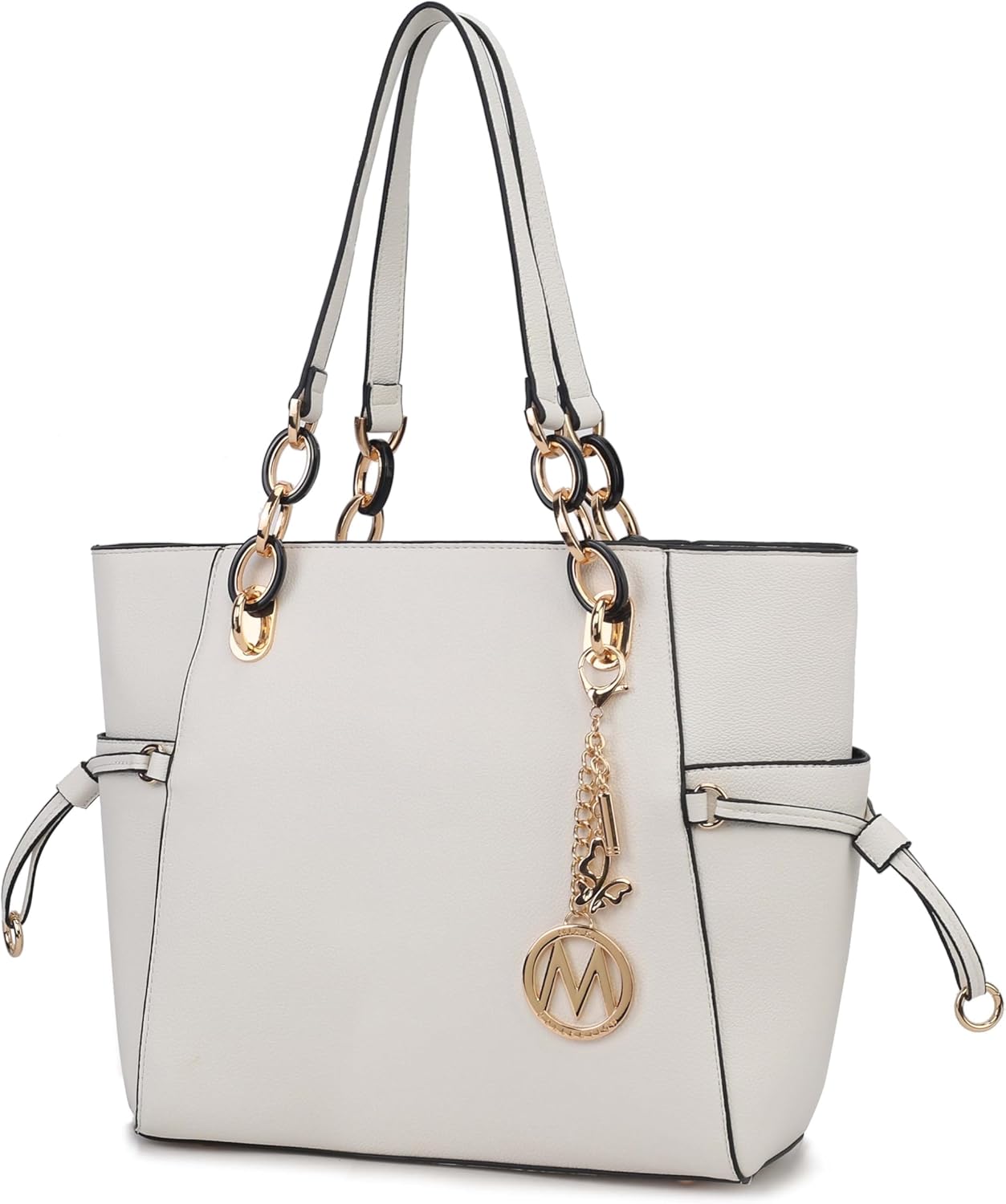 The Yale Tote Bag by MKF Collection is a sophisticated and practical everyday handbag, crafted from high-quality vegan leather for a luxurious yet cruelty-free finish. Designed with elegant gold-tone hardware and a decorative removable M keychain, this tote offers a timeless look that transitions effortlessly from workdays to weekend outings.The tote features a secure top zipper closure that opens to a spacious, fabric-lined interior, providing ample room for your daily essentials. Inside, the large compartment includes a wall zipper pocket and two slip-in pockets to help keep your belongings neatly organized. The slightly structured silhouette allows the bag to maintain its shape, while protective metal feet at the base help keep it upright and protected.For additional convenience, the exterior is designed with two front slip-in pockets, offering quick access to frequently used items such as your phone or keys. With its polished design and functional layout, the Yale Tote Bag combines style, durability, and everyday versatility.MEASUREMENTS:• Tote: 15 in L x 11 in H x 4 in D• Handle Drop: 10 inDETAILS:• High-quality vegan leather• Top zipper closure• Gold-tone hardware• Decorative removable M keychain• Metal feet and slightly structured silhouette• 1 interior wall zipper pocket, 2 interior slip-in pockets• 2 exterior front slip-in pockets