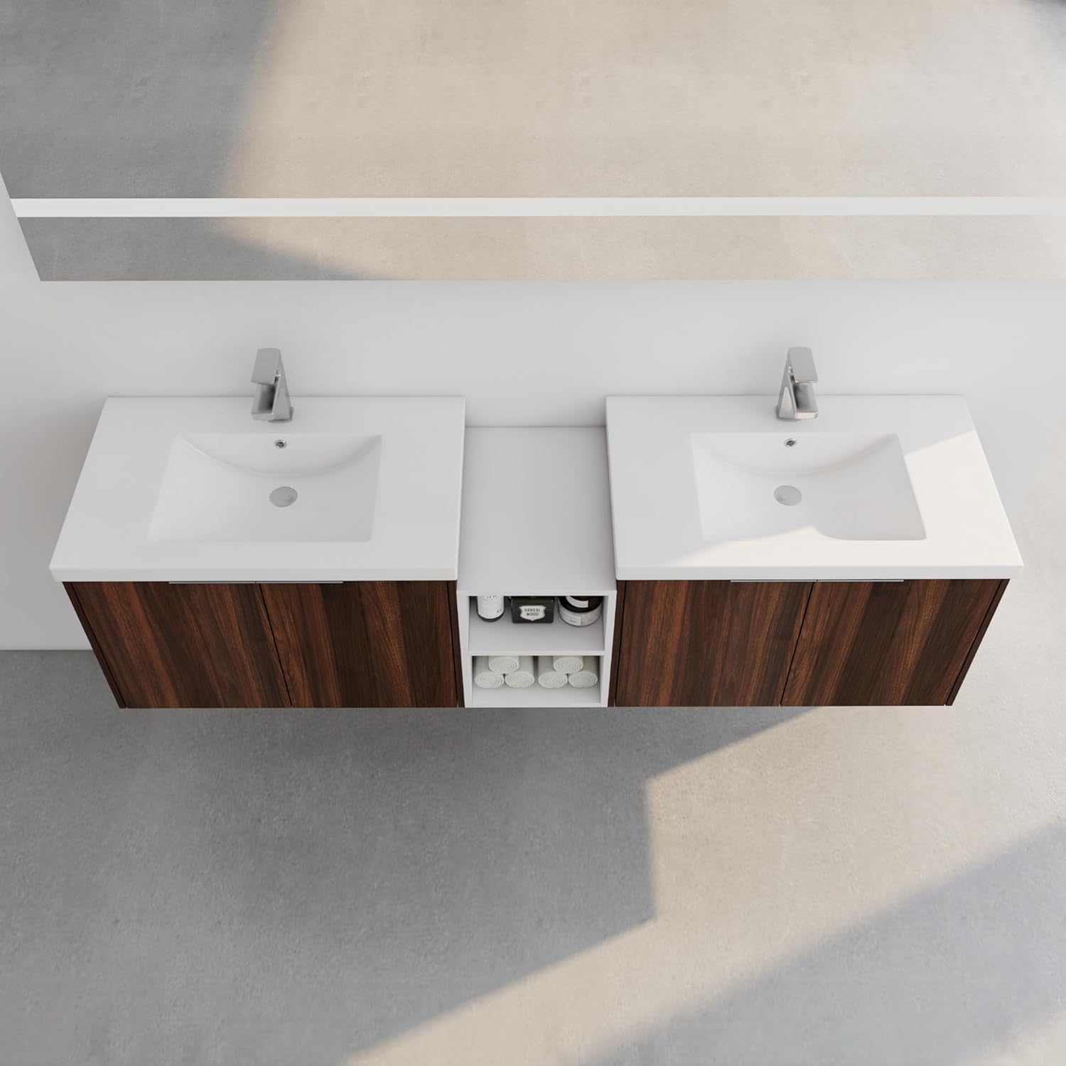 šProduct Description: Our ample two-door cabinets offer sufficient bathroom storage. The Wall Mounted design makes the product more simple and generous. The space at the bottom can be more convenient for placing dirty clothes baskets and daily cleaning. šSpecifications: 1. Material: Plywood + Ceramic Basin 3. Dimensions: (59.6 x 18.5 x 20.7)" (L x W x H) 4. Weight: 122.1lbs šPackages Included: 1. The vanity and ceramic sink are shipped in two separate packages.(Probably will be delivered at different time,please notice and hope to get your understanding,thanks.) 2. 2x Vanity Cabinets; 1x Small Storage Shelves; 2x Ceramic Basin; 4x Metal Handle šPackages Not Included: Faucet, Pop-up Drain, Drain Assembly, P-Trap, Back-splash and Mounting Bracket