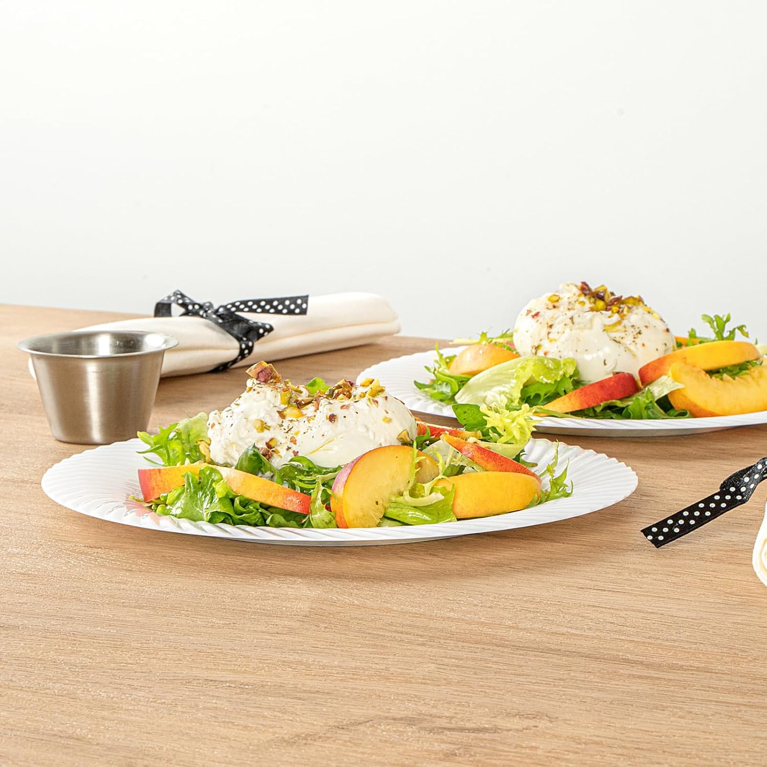 Enhance your table setting with our Moderna Round White Plastic Wave Plates. Made from durable PS plastic, these round dinner plates are sturdy to hold heavy foods. Fashioned with a wave pattern, these unique dinner plates add an elegant touch to your party tablescape. These premium plastic plates are sustainable, minimizing your carbon footprint at your event. Withstanding up to 150F, these white plastic plates allow you to serve warm and cold foods comfortably. These heavy-duty dinner plates are greaseproof to keep your tablescape tidy. To avoid tedious washing after events, these fancy plastic plates are conveniently disposable. Featuring a white finish, these greaseproof plastic plates add an attractive touch to your tableware. Measuring 9 inches in diameter, these white plastic plates are ideal for serving all kinds of starters, entrees, and desserts. Shipped in a 200 count box.