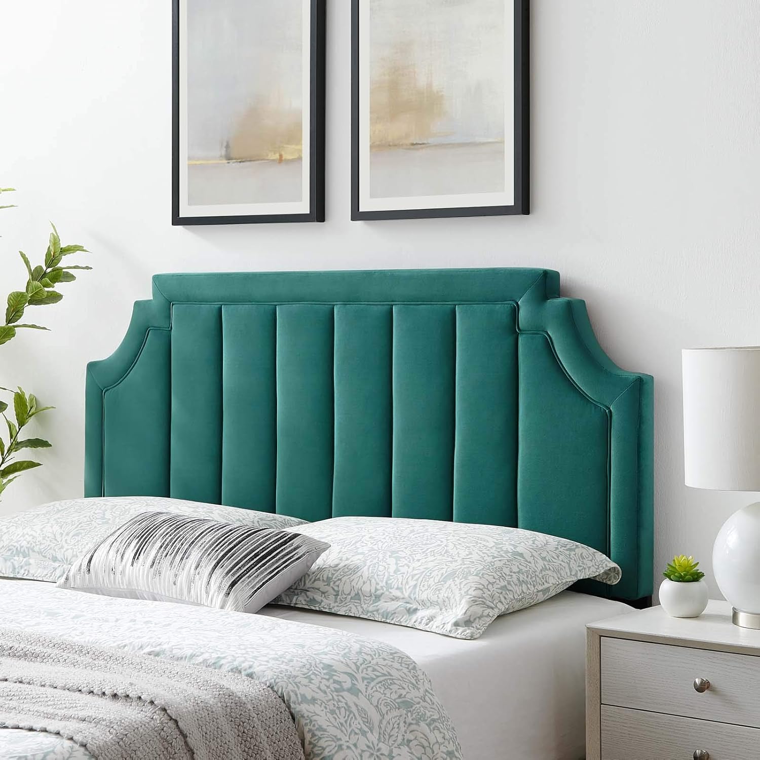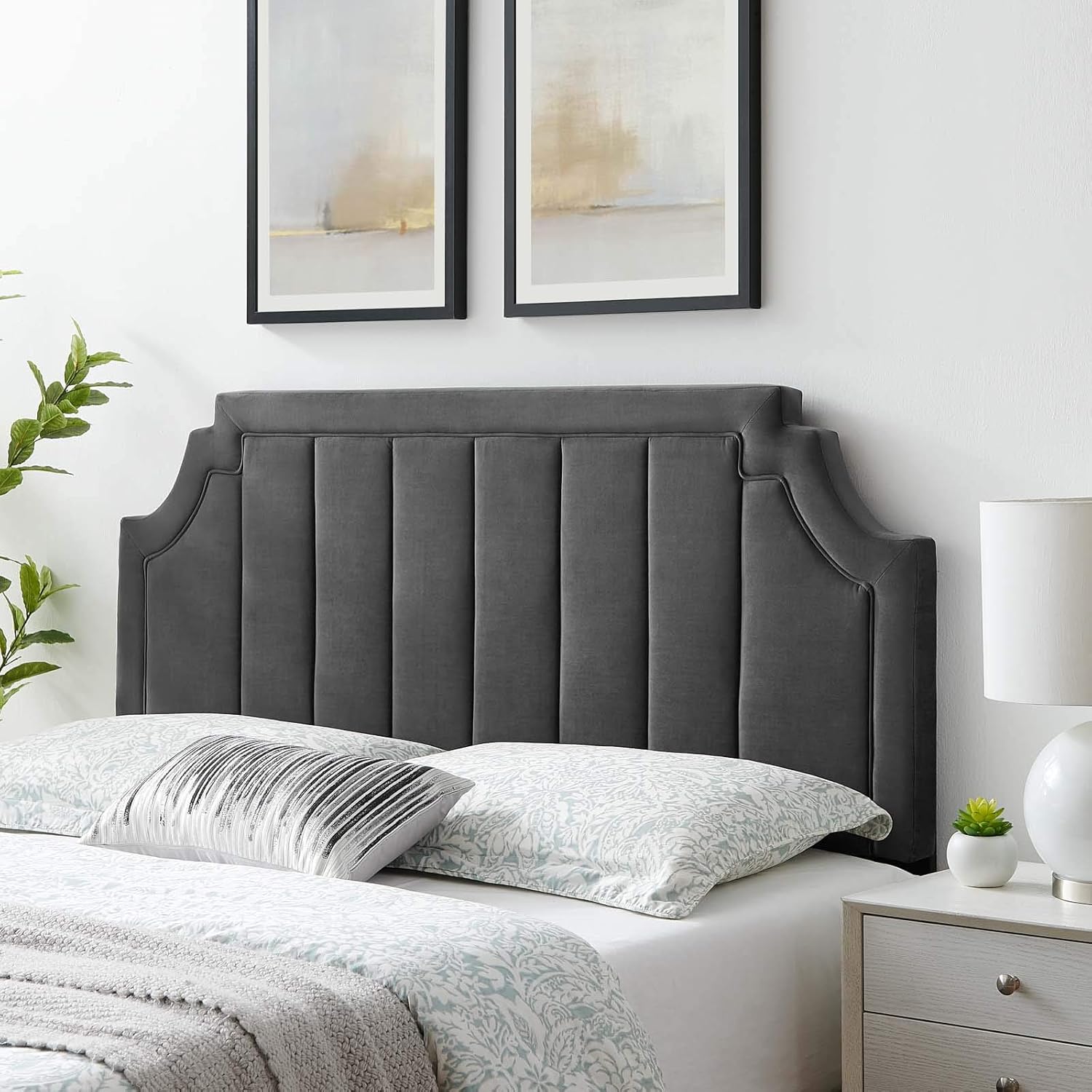 With vertical tufting, a unique silhouette, and luxurious texture, the Alyona Channel Tufted Performance Velvet Full/Queen Headboard brings glam deco style and vintage modern elegance to your master bedroom or guest bedroom. This full or queen size headboard features a beautiful shape, channel tufting, and subtle French piping. Upholstered in soft, stain-resistant performance velvet, this padded headboard offers supportive comfort while sitting up in bed resting or relaxing. A beautiful backdrop for a variety of bedding styles, this adjustable headboard fits full or queen beds with its three mounting positions. Assembly required.