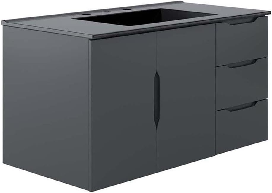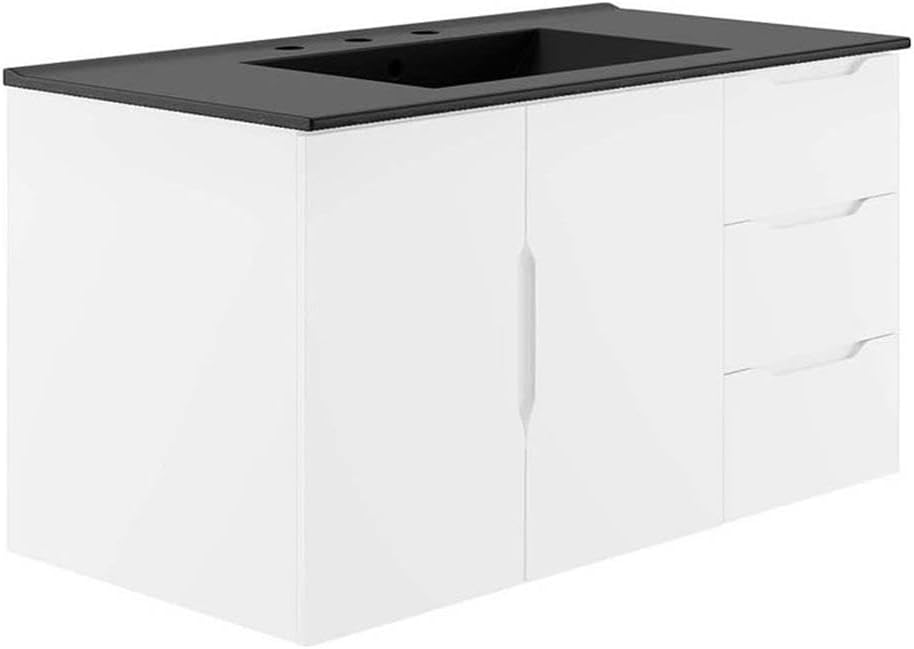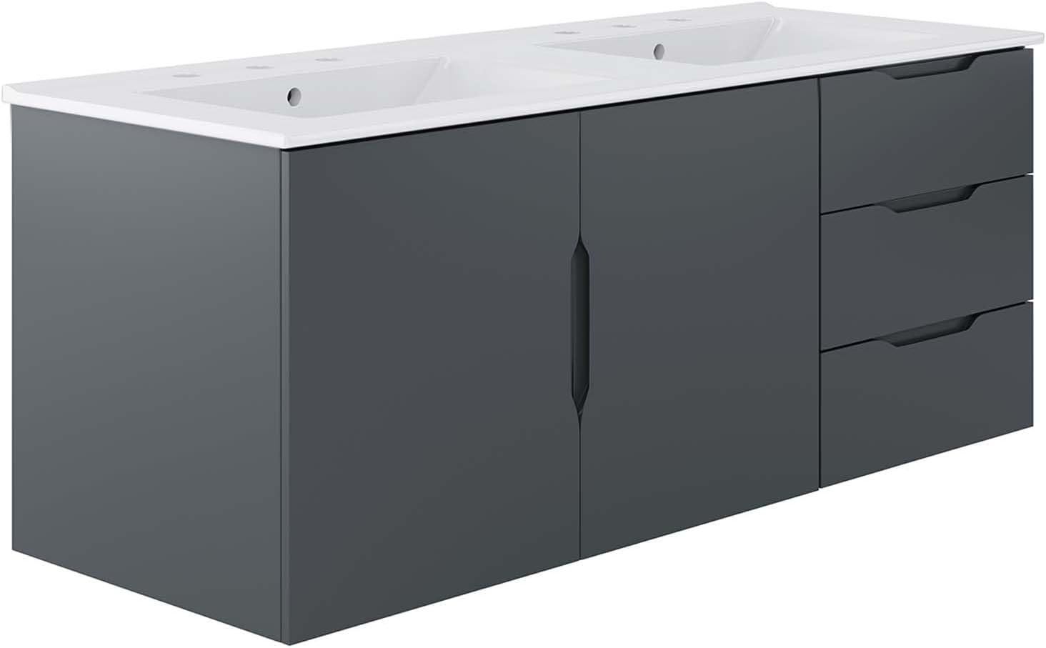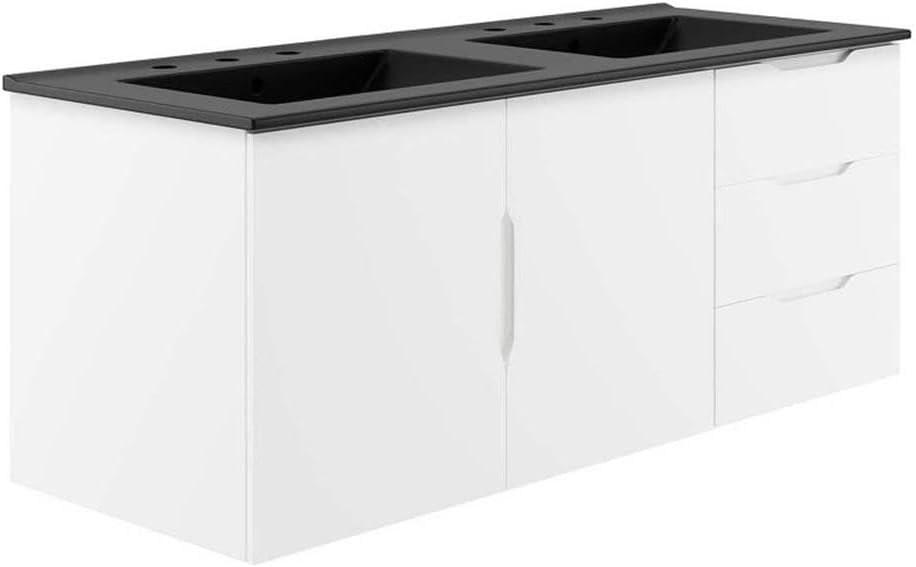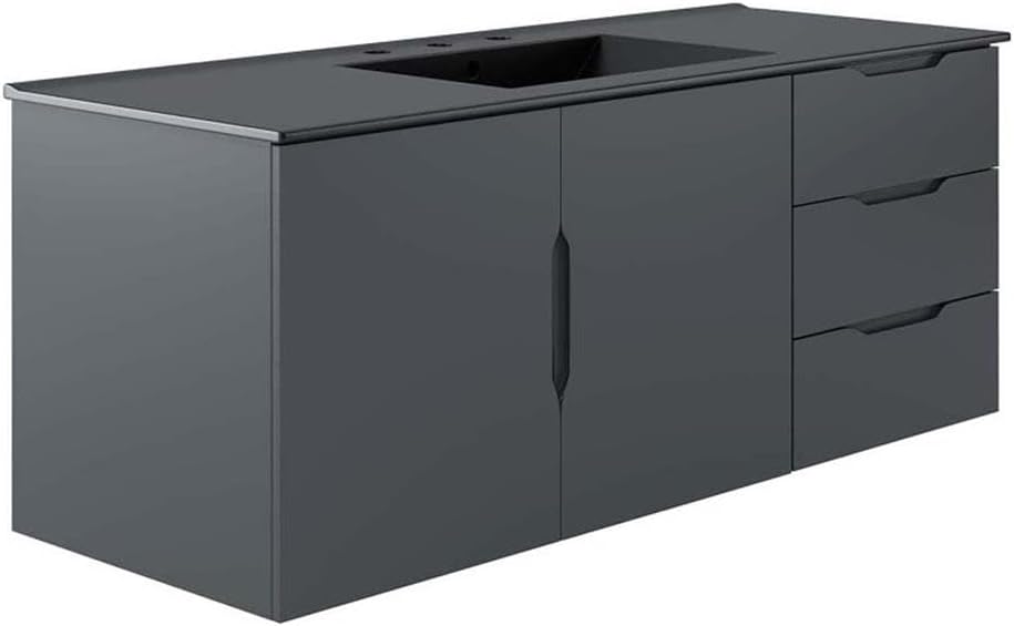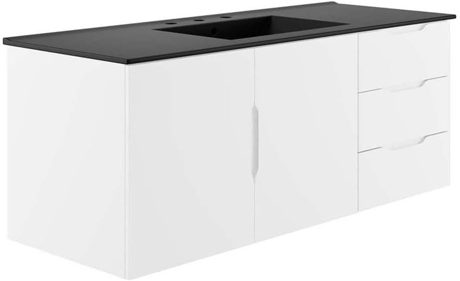 0Energize your bathroom space with the modern design of the Vitality 48" Wall-Mount Bathroom Vanity. Boasting a sleek, clean-lined silhouette, this vanity is durably crafted with particleboard and MDF with a melamine finish. This vanity features a wall-mount design and is complete with ample storage space for all your bathroom essentials with two spacious drawers and an under-sink storage area behind two soft-close doors. This vanity is complete with a ceramic sink basin with 8-inch centerset holes and an integrated countertop. This vanity boasts an open back to accommodate plumbing. Fixtures not included. Assembly required.