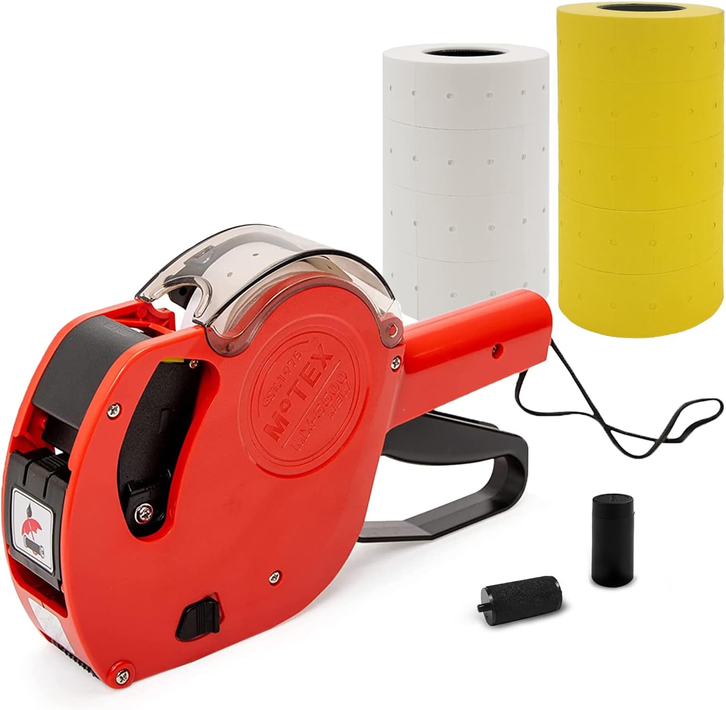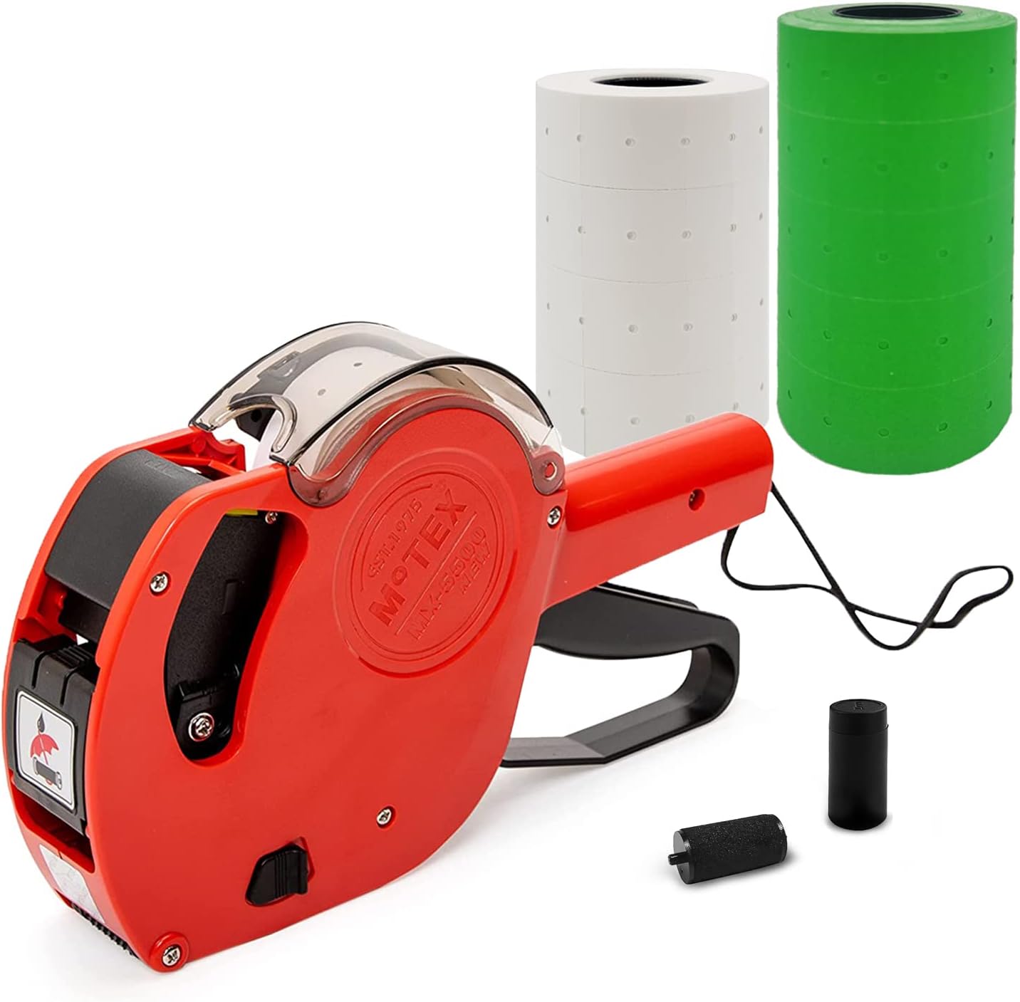 | BuiltIn Media | 1 Motex MX-5500NEW pricing gun labeler, 1 pre-loaded 1,000 white blank labels, 3,000 fluorescent green blank labels, 3,000 fluorescent red blank labels, 3,000 fluorescent yellow blank labels, 1 inker with pre-loaded ink roll, 1 instruction manual |