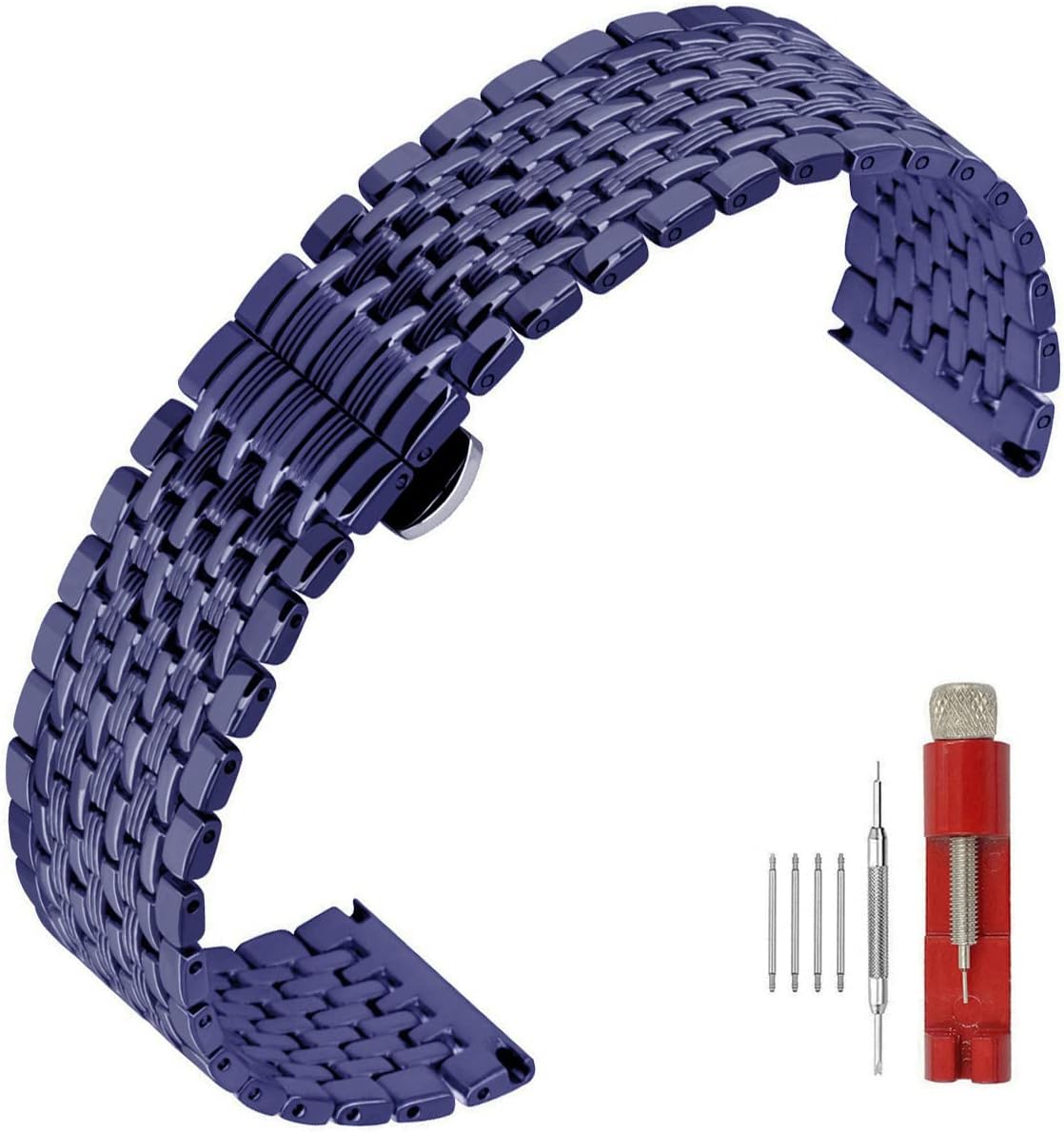Multi colors/sizes’ choices available: Besides normal silver and black colors, also proving dark blue, gold and rose gold, two tones bracelet to fit 18mm 20mm 22mm watch lug width, highlighting the iconic design features of this classic stainless steel watch band.