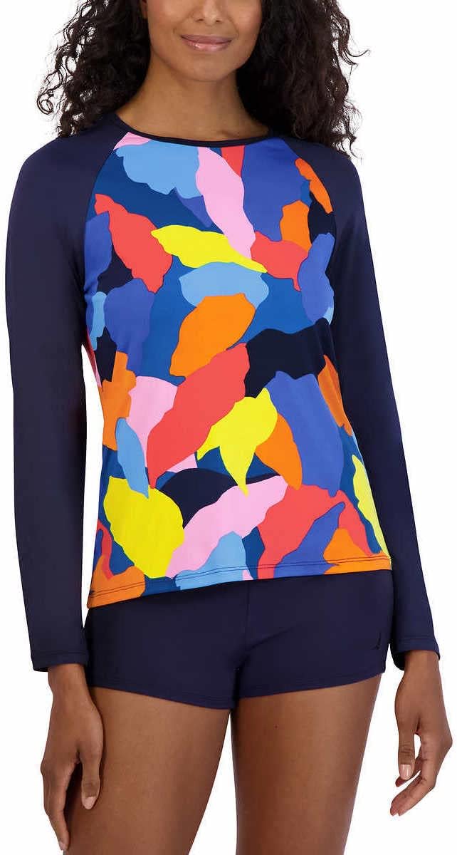 Stay protected and stylish with the Nautica Women's Long Sleeve Rash Guard, designed for performance, comfort, and versatility. Whether you're surfing, swimming, hiking, or working out, this quick-dry swim shirt provides superior UPF 30+ sun protection and moisture-wicking fabric to keep you cool, dry, and comfortable. Engineered with stretchy, breathable material, it allows full range of motion for any activity while ensuring a sleek, flattering fit. Pair it with Nautica Women’s Bikini swimsuit for the ultimate active wear look. Ideal for travel, water sports, beach vacations, or everyday workouts, this Nautica rash guard blends fashion with high-performance features to keep you moving in confidence.