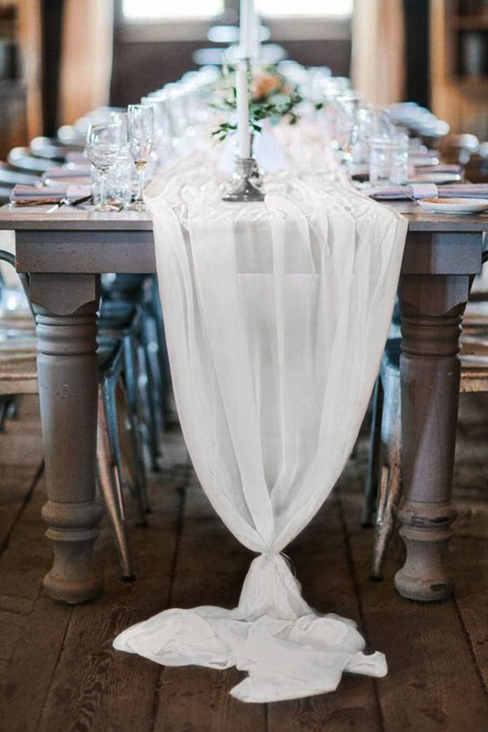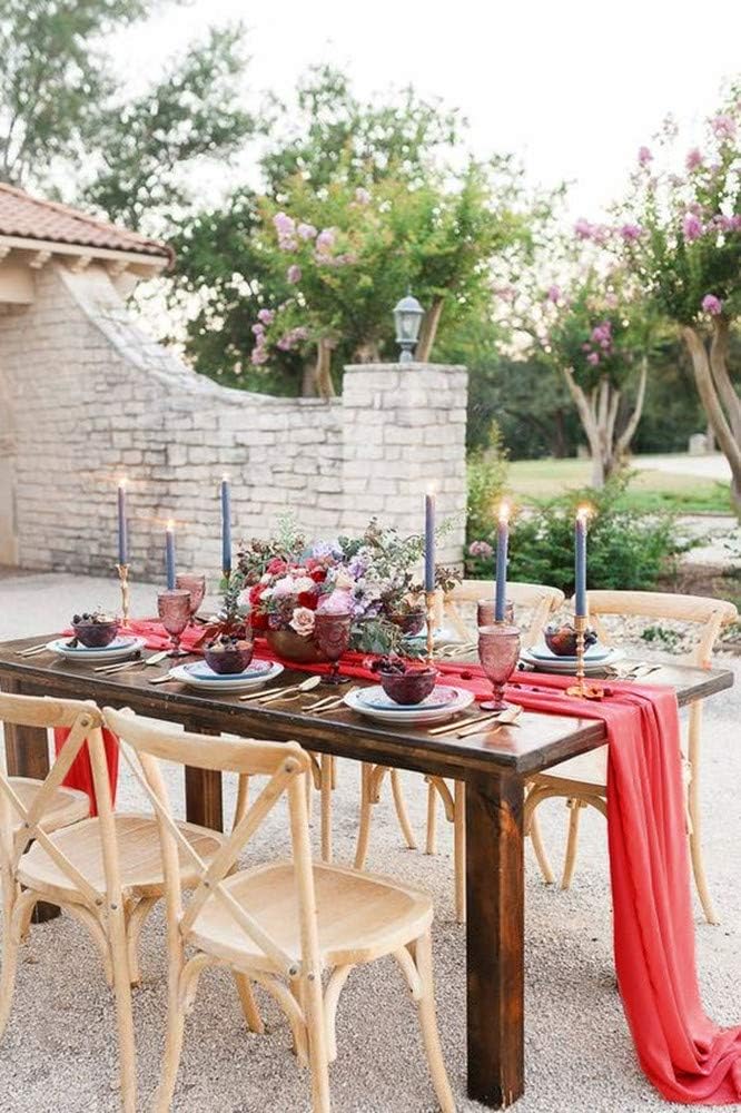 Add a touch of romance and exquisite glamour to your wedding or special event with our fine sheer chiffon table runners. Our chiffon linen is silky and expertly made for a flowy look. Each specialty table runner is hemmed and machine stitched for durable use. Dress up your wedding reception tables, sweetheart table, and cake table with our easy to use long table runners. Use our lovely chiffon wedding runners with farm tabletop display, vintage decor, romantic wedding decor, wedding ideas, beach wedding decor and more!
