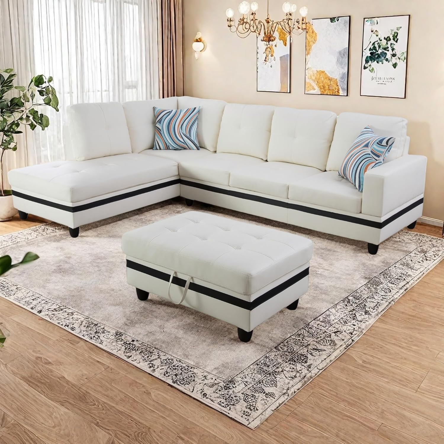 NicBex Modular L-Shaped Sectional Couches, 3-Piece Convertible Couch with Storage Ottoman, 4-Seat Comfy Sofa With Chaise for Living Room & Apartment, Grey White