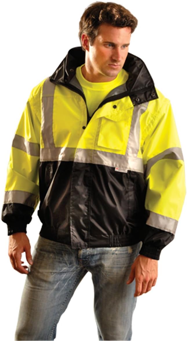 2" 3M Scotchlite reflective material backed by contrasting ansi compliant trim. 100% ansi polyester with pu coating - breathable, waterproof with sealed seams. Removable 100% black polyester fleece liner. Weather resistant construction. Pockets: 2 outside, 1 inside, 1 radio. Zipper and snap closure.