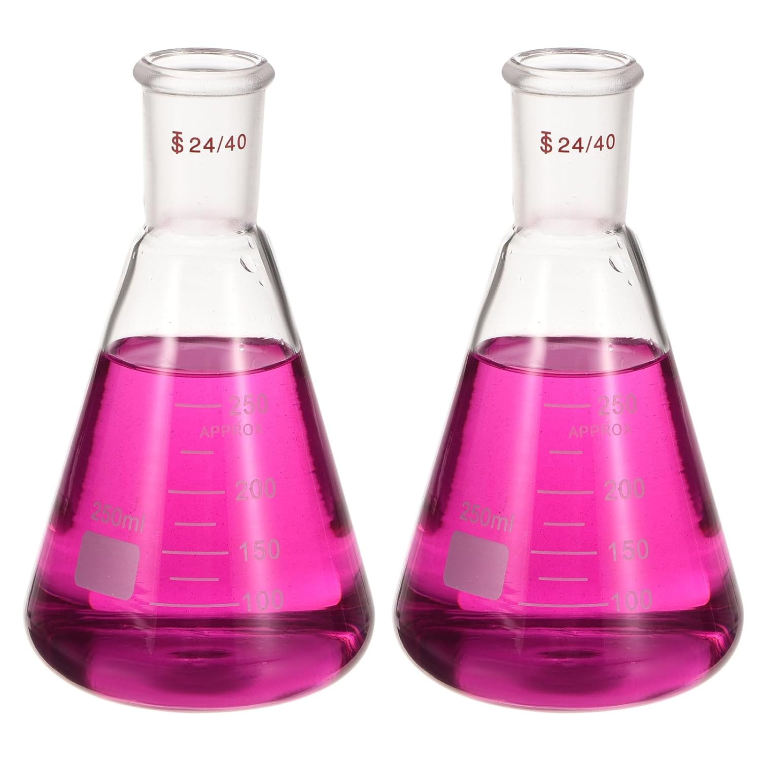 Glass Erlenmeyer Flasks are versatile and reliable tools for accurately measuring, mixing and storing liquids in a laboratory setting. They are widely used in scientific laboratories, education, industrial research and development, etc.Specification:Color: TransparentMaterial: High Borosilicate GlassCapacity: 500ml/16.9ozTotal High: 182mm / 7.17 inchBottom Diameter: 106mm / 4.17 inchBottle Mouth Outer Diameter: 34mm / 1.34 inchStarting Scale: 200mlPacking List: 2 x Glass Erlenmeyer FlaskAdvantage:Good High Borosilicate Glass: The Erlenmeyer flask uses high borosilicate glass, which is high temperature resistant, chemically stable, and has strong corrosion resistance;Clear Scale: The scale on the surface of the graduated flasks is clear, allowing precise volume measurement to ensure the accuracy of the experiment;Narrow Mouth Design: The narrow mouth design of the Erlenmeyer flask can prevent experimental liquids from volatilize, and evaporating;Standard Joint Design: The standard 24/40 neck design can be used seamlessly with a variety of standard laboratory accessories. The frosted design of the bottle mouth can increase the contact area between the conical bottle and other laboratory equipment to ensure sealing and accuracy.Instruction:Easy to Use: Suitable for beginners and professionals. The glass erlenmeyer flask is great for teaching activities, fun experiments, etc. It is convenient and practical.NOTE:1. Please check the size before purchasing.2. Please handle glass products with care.