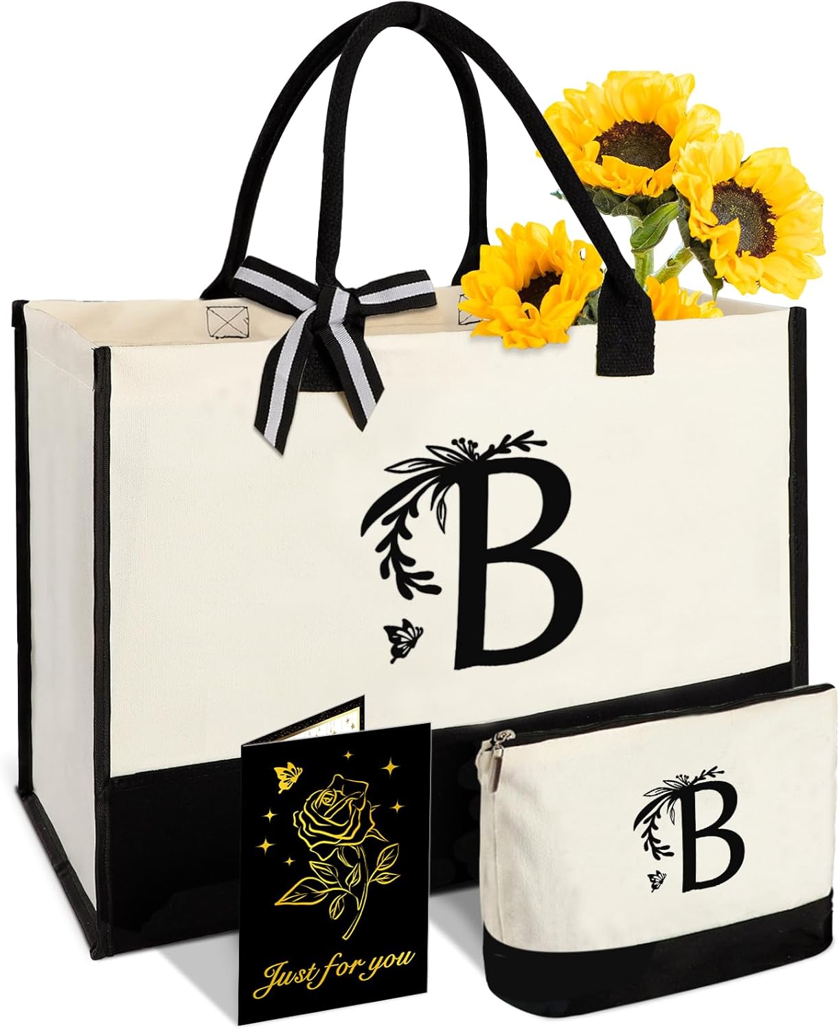 Personalized Gifts for Women - Initial Canvas Tote Bag & Makeup Bag, Custom Bags for Beach, Christmas, Wedding, Birthday, Holiday, Monogram Birthday Gifts for Women, Mom, Wife, Teacher, Friend - S
