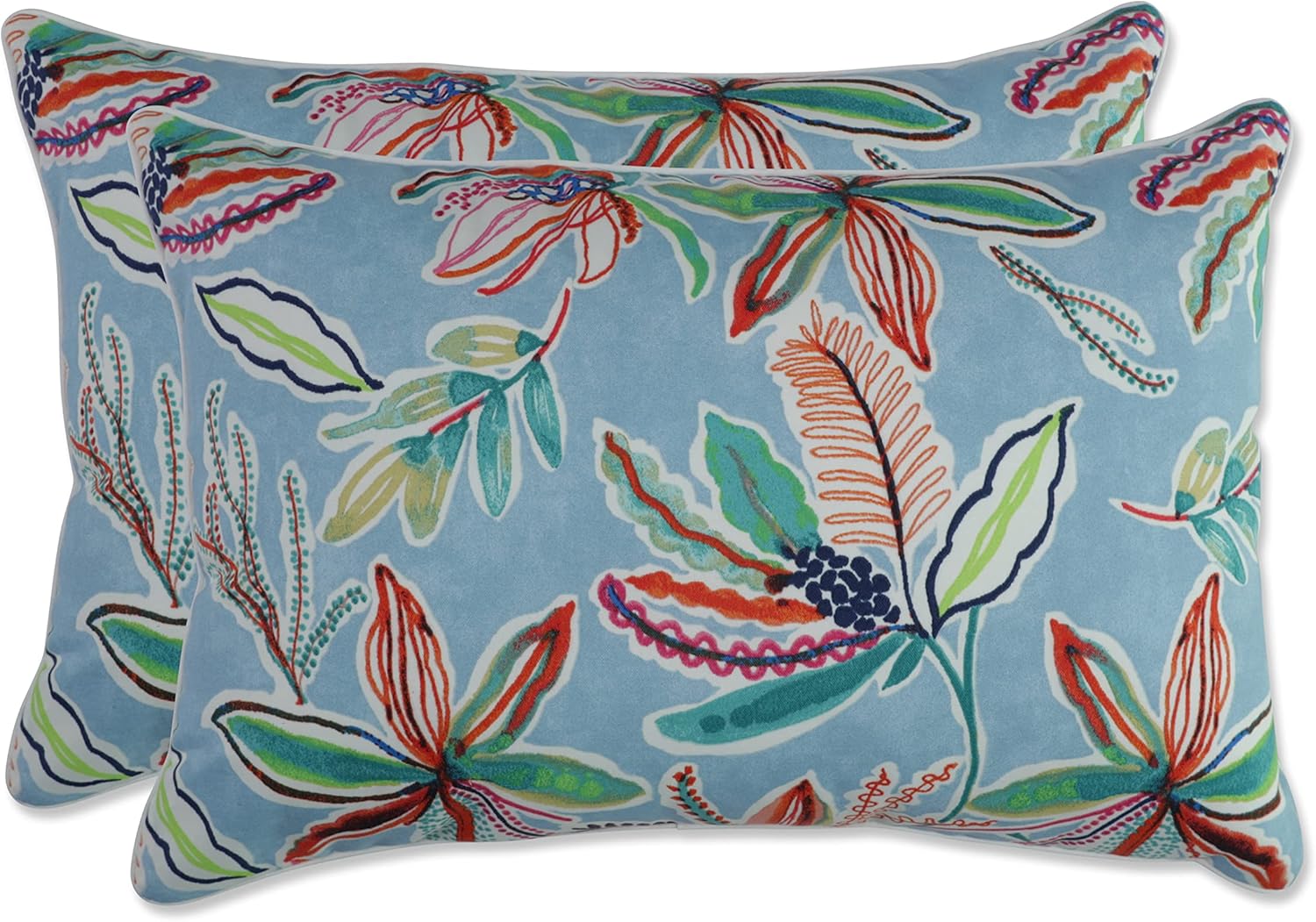 Accent your patio or deck in the gorgeous look of a tropical rainforest with this set of two outdoor oversized lumbar pillows. Their leafy print pattern, in watercolor shades of green and blue with white outlined leaves, covers the linen textured fabric. Additional features of these outdoor oversized lumbar pillows include self welt cords for a clean finish and recycled polyester fiber fill with sewn seam closures. Also suitable for indoor use.