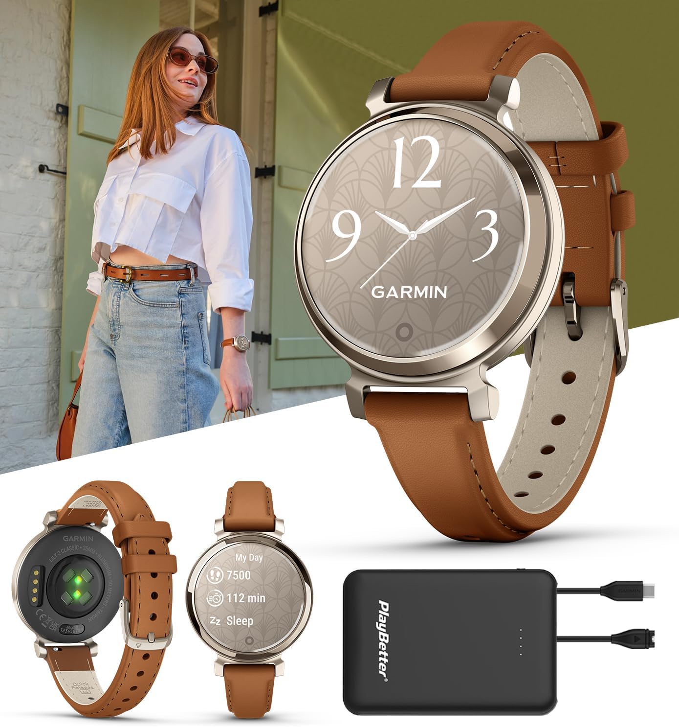 | BuiltIn Media | Charging Cable, Documentation, Garmin Lily 2 Women's Fitness Smartwatch, PlayBetter Portable 5000mAh Charger |