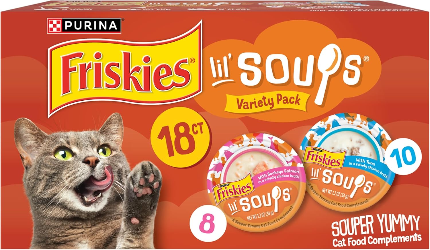 Indulge your favorite feline's taste buds by offering her recipes from this Purina Friskies Lil' Soups Seafood & Chicken adult wet cat food complement variety pack. Four delectable selections that feature real seafood or chicken in every cup bring delicious goodness to her dish. She's sure to love the tender texture and enticing aroma found in every serving of these adult wet cat food complements. You can feel good about feeding your precious cat yummy snacks that contain no fillers, by-products, artificial colors, flavors or preservatives. A velvety broth rounds out each cat complement variety, bringing added flavor and moisture to every whisker-licking bite. These treats for cats feature a rich aroma that calls out to her every time you open a cup, letting her know something amazing is coming. They're intended as a complement to your cat's complete and balanced diet, so you can serve Purina Friskies Lil' Soups between meals or with her usual food to reward your special feline friend.
