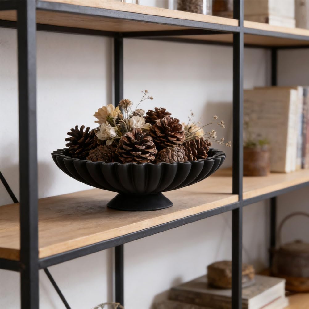 Elevate your home with this large black decorative pedestal bowl, a stylish addition to any modern or contemporary living space. Handcrafted from durable resin, it combines functionality with decorative flair, serving as a black fruit bowl, black key bowl, or black candy dish. The fluted design and elegant pedestal create a bold yet sophisticated statement on your coffee table, entry table, side table, or kitchen counter With a generous diameter of 10" and height of 3", this black decorative bowl offers ample space for fruits, candy, keys, coins, access cards, earbuds, remotes, glasses, or aroma sticks, while also serving as a stylish black round decorative tray for seasonal or festive displays like pinecones, dried flowers, and ornaments. The handcrafted resin construction ensures durability and a smooth, matte finish for a premium look and feel Perfect as a versatile centerpiece for living rooms, kitchens, entryways, bedrooms, and offices, this modern black decor accent blends seamlessly with rustic farmhouse, minimalist, and contemporary interiors. Its multifunctional design and timeless appeal make it a great gift for housewarmings, birthdays, holidays, or for anyone looking to add an elegant, practical accent to their home