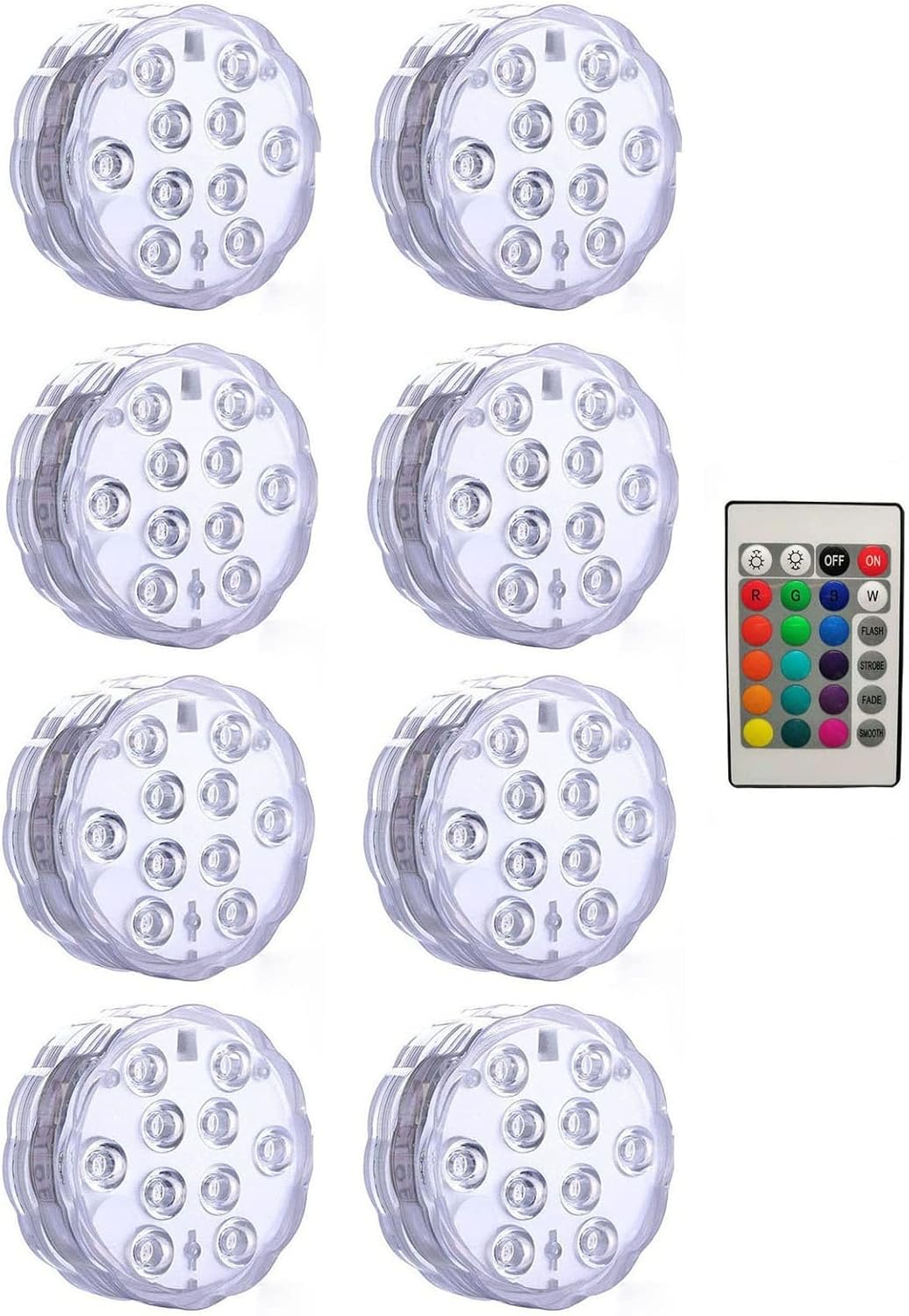 Pond Lights10 Led Remote Controlled RGB Submersible Light Battery Operated Underwater Night Lamp Outdoor Vase Bowl Garden Party DecorationSpecial FeatureReusable:Operated by 3 x AAA batteries, Easy to replace,save money for youMulti Color:super bright 10 led built in,4 dynamic color changing modes, 16 different colors in static modes.Waterproof:The LED lights are made of double waterproof materials,Don't worries about that when submerged.Remote control: wireless design,IR remote control, dimming and ON/OFF.Multi-Purpose:Great for flower vases,pool,fish tank,wedding, party or other occasionsNotice:* Make sure that screw up the cap clockwise properly and tightly before throw it into water.* When the battery runs out,the lights stay stuck in red,if no longer switching between colors and remote stop work,then please replace the battery.* The max. depth to is recommend to be less than 2m.Specifications:Wattage: 2.4W per pieceLight color: RGBPower : 3 * AAA batteries per piece (not provided)LED quantity: 10 LED beads per pieceIngress protection: IP68Item weight: 60gper pieceItem size: 7 * 7 * 2.8cm /2.75 * 2.75 * 1.10in(L * W * H) per piecePackage weight: 300g / 10.56ozPackage list: 19.7 * 18 * 5cm / 7.75 * 7.08 * 1.96in(L * W * H)