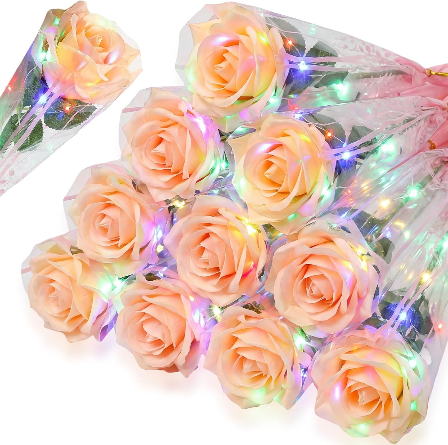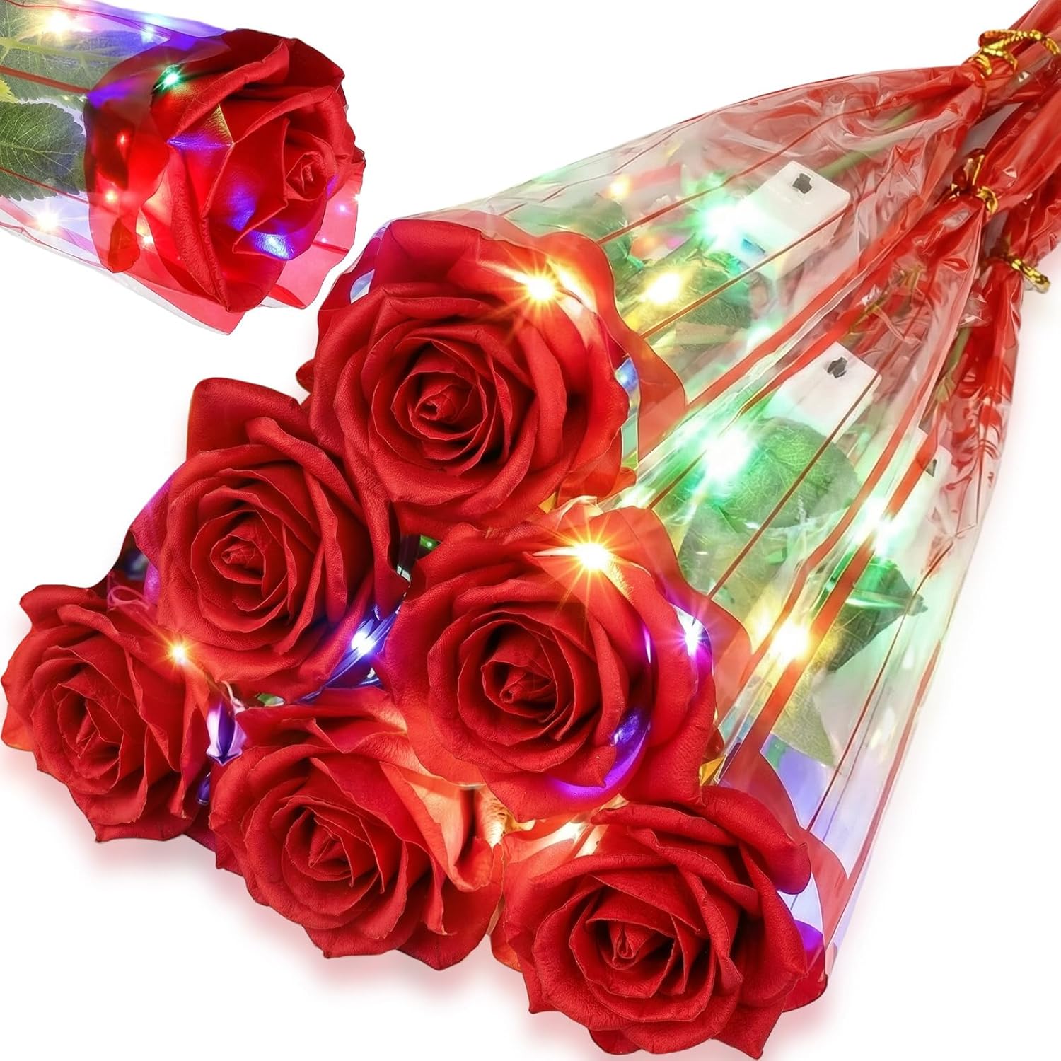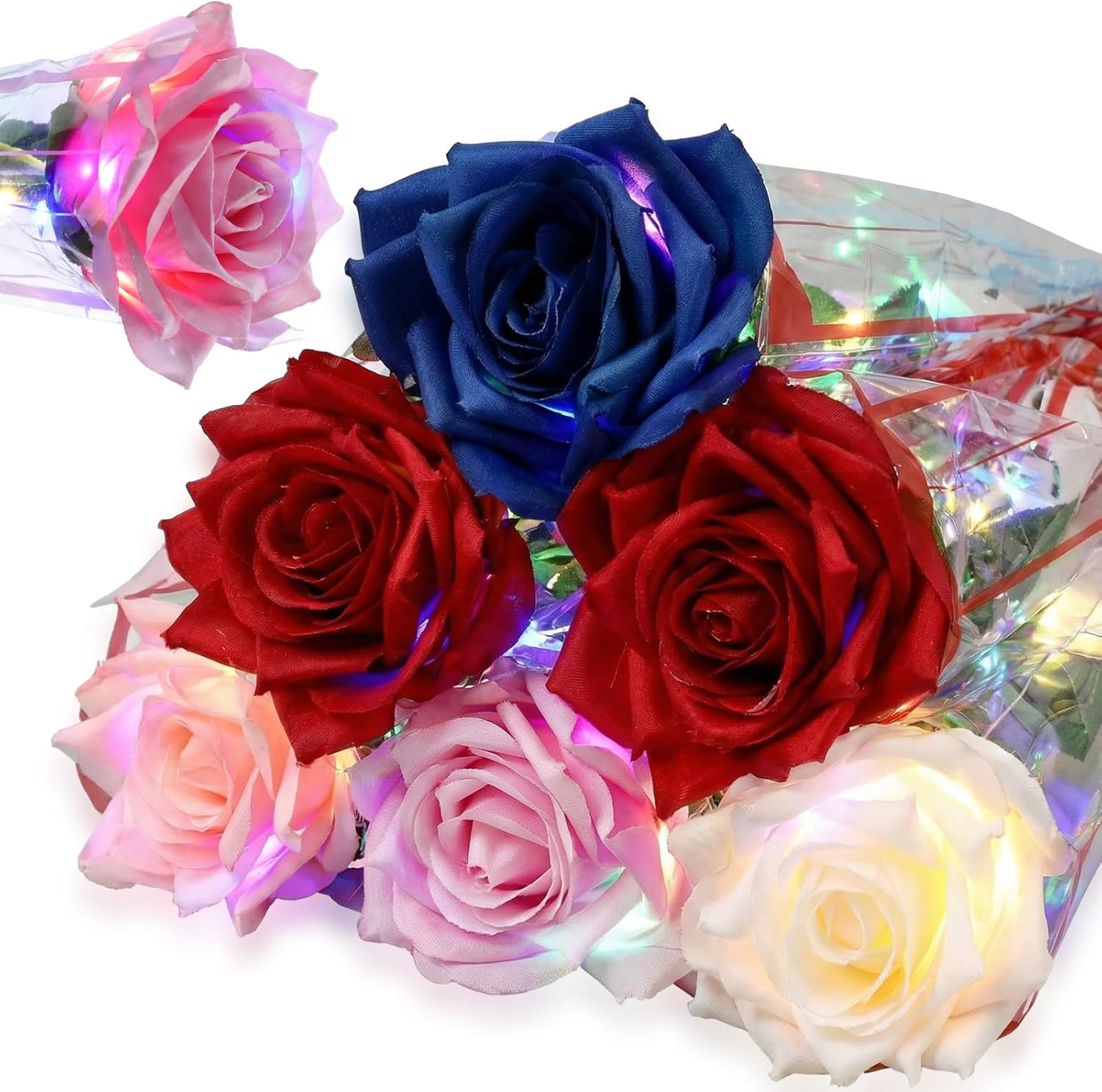 Features: Enhance the ambiance of multiple occasions by mix and matching different glowing roses. The variety allows you to create a different set of decor for each special event, setting the ideal atmosphere for celebration. The Valentine's Day rose comes in sufficient quantity to create your own decorations. Use your imagination to craft banquet arrangements or decorate your living spaces. Specifications: Main material: LED, plastic, silk Color: as shown in the picture Size: Total length: about 12.6 inch/ 32 cm Flower length: about 2.36 inch/ 6 cm Package includes: 24 x Glowing roses Notes: Warm reminder: " For safety and longer life, always fully unfold the bulbs before use. Bundling them can cause overheating and hazards. ” Manual measurement, please allow slight errors on size. The color may exist a slight difference due to different screen displays
