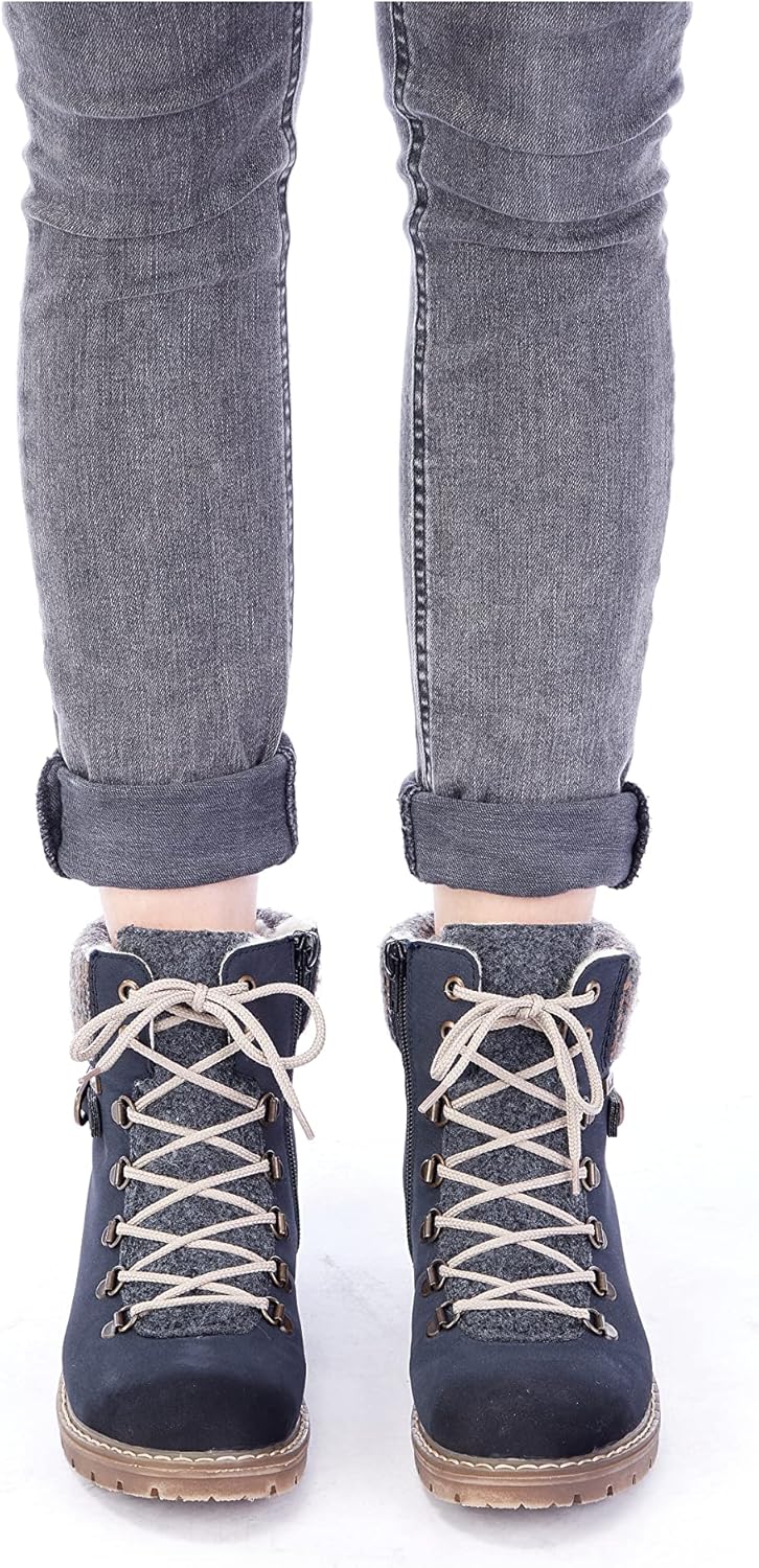 Cold days, warm feet. The dark blue Rieker lace-up boots are not only a real eye-catcher, but also incredibly comfortable for everyday use. The shoe is made in the braided style, which makes it particularly robust and flexible. Despite the zip, the shoe can be easily closed with lacing. The shaft collar in knitted look rounds off the modern design perfectly. The block heel sole is easy to grip and provides good grip at all times. In addition, the extra soft insole ensures an extra dose of comfort. The water-repellent RiekerTEX membrane protects the feet from moisture and wind, while the cuddly lining keeps them warm for a long time. So nothing like going on.