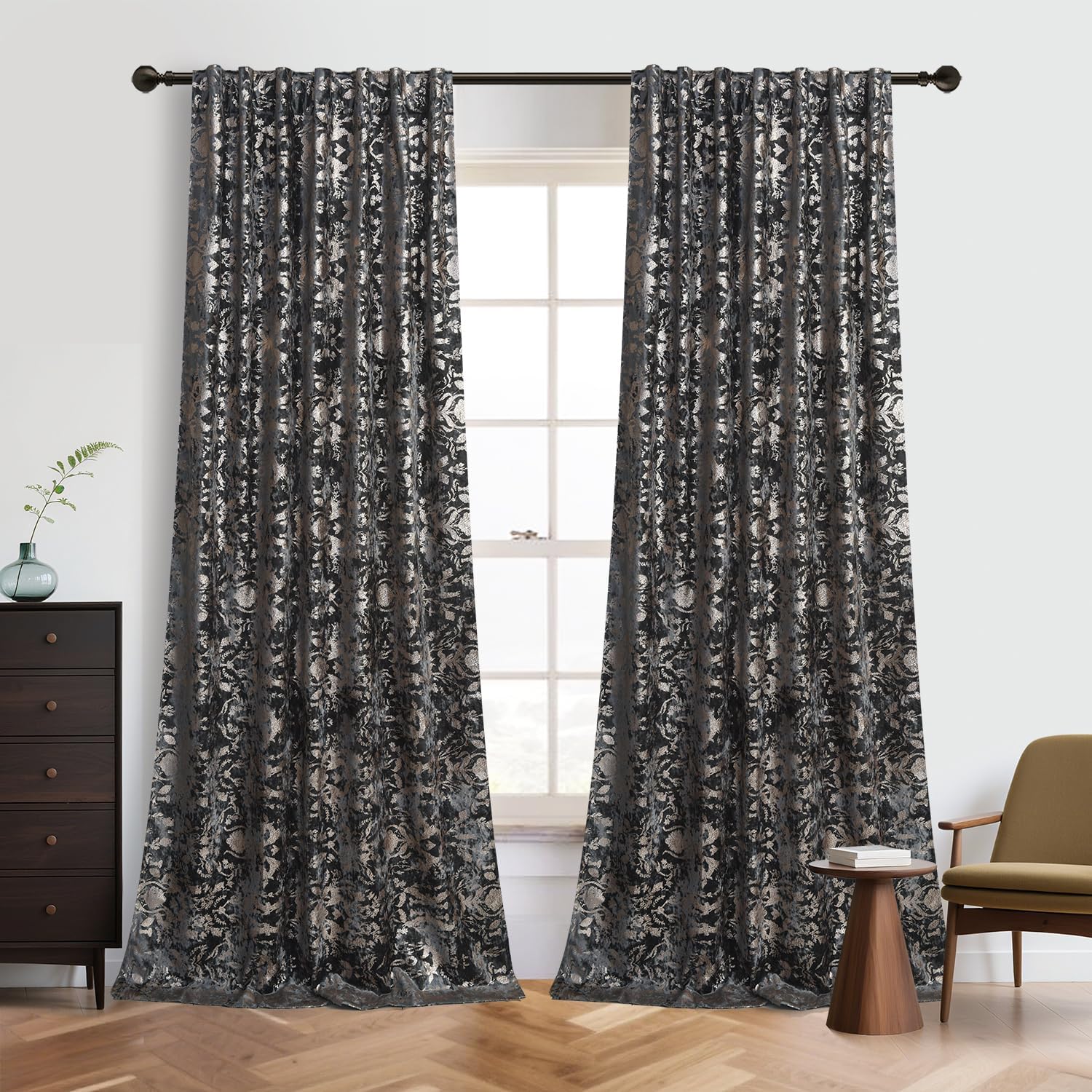 Give your home a decorator’s touch with the roslyn home velvet Window Curtain. Offers a classic look in an array of fashionable colors, It's coordinates well with any room setting Polyester blackout layer provides enhanced light filtration and privacy Room darkening, noise reducing and insulating, help saving heating & cooling cost Machine washable in cold water, tumble dry. Quick ironing or steam clean as needed. Panels are sold in pairs and each measures 52" W