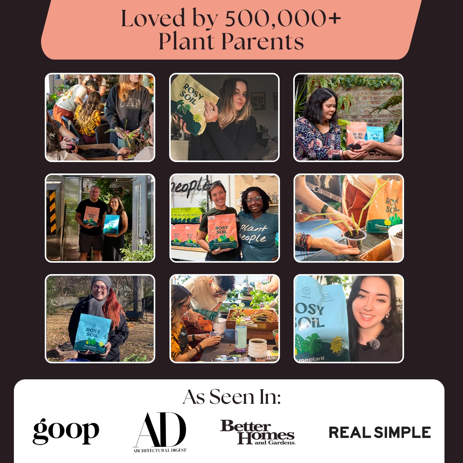 Support every stage of indoor plant growth with the Rosy Soil Houseplant Soil + Cactus Soil + Plant Food Bundle - a complete, soil-to-nutrition solution designed for diverse indoor plant collections. This bundle pairs Rosy Soil Indoor Potting Mix for moisture-loving houseplants with Rosy Soil Cactus & Succulent Potting Mix for drought-tolerant plants that require fast drainage and airy structure. Together, they create the ideal foundation for foliage plants, flowers, herbs, succulents, and cacti—ensuring roots receive the right balance of air, water, and nutrients. To complete the system, Rosy Soil Organic Plant Food delivers slow, consistent nutrition through biochar, kelp, and worm castings, supporting healthy growth across all plant types. Microbially active and peat-free, each component works in harmony to build living soil that promotes stronger roots, vibrant foliage, and long-term plant health. Whether you’re refreshing multiple pots or caring for a mixed indoor garden, this bundle simplifies plant care while staying true to sustainable gardening values.