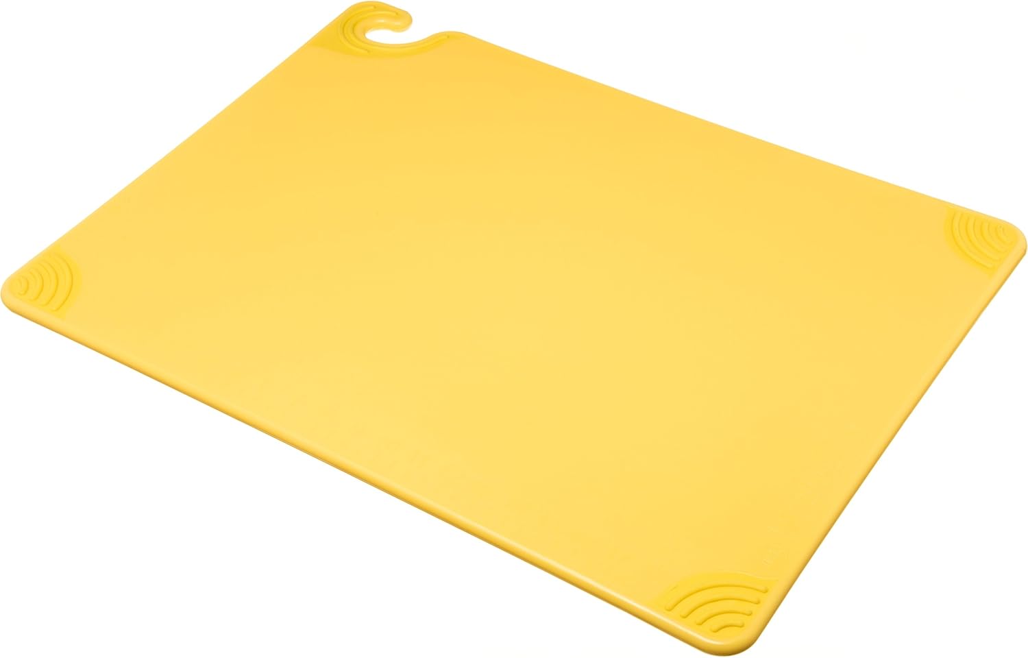 Introducing the Saf-T-Grip Cutting Board - the ultimate solution for safe and efficient food preparation in any commercial kitchen or foodservice environment. Measuring 18 inch x12 inch with a thickness of .5 inch , this cutting board is the perfect size for a variety of cutting tasks, from slicing vegetables to carving meats. The Saf-T-Grip Cutting Board features anti-slip grip corners, ensuring it stays securely in place during use, even on slippery surfaces. The food safety hook allows for easy and clean storage, while the molded-in ruler helps to ensure accurate portioning and cutting. With HACCP color coding, this cutting board is easy to identify and use for specific food groups. The warp-resistant co-polymer blend construction is designed to withstand frequent use, while minimizing knife dulling, ensuring a sharp edge for longer. This cutting board is also NSF listed, ensuring it meets strict standards for safety, quality, and performance. It is also dishwasher safe for easy cleaning, making it the perfect choice for busy commercial kitchens and foodservice operations. Whether you're a restaurant, catering business, or other foodservice operation, the Saf-T-Grip Cutting Board is an essential tool for safe and efficient food preparation. Order yours today and experience the difference.