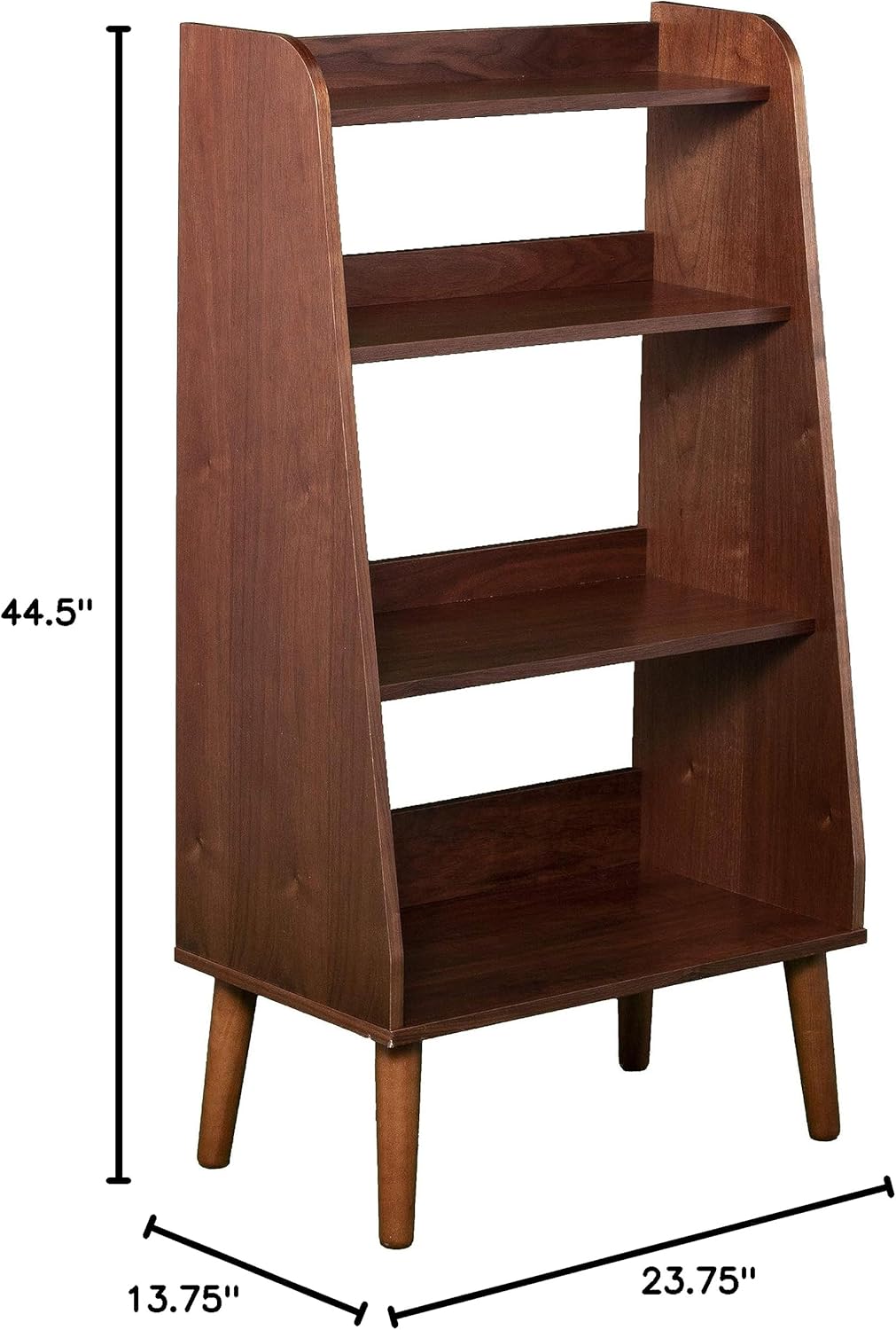 Max out your midcentury modern design with this wooden bookcase. Four shelves of varying sizes provide a home for books and notepads, while classic spindle legs leave a minimal footprint. Doubling as a home bar, your favorite spirits and bar accessories look elegant displayed on this walnut-finished bookshelf. Upgrade with midcentury flair when you place this storage shelf in your home office or bar area.