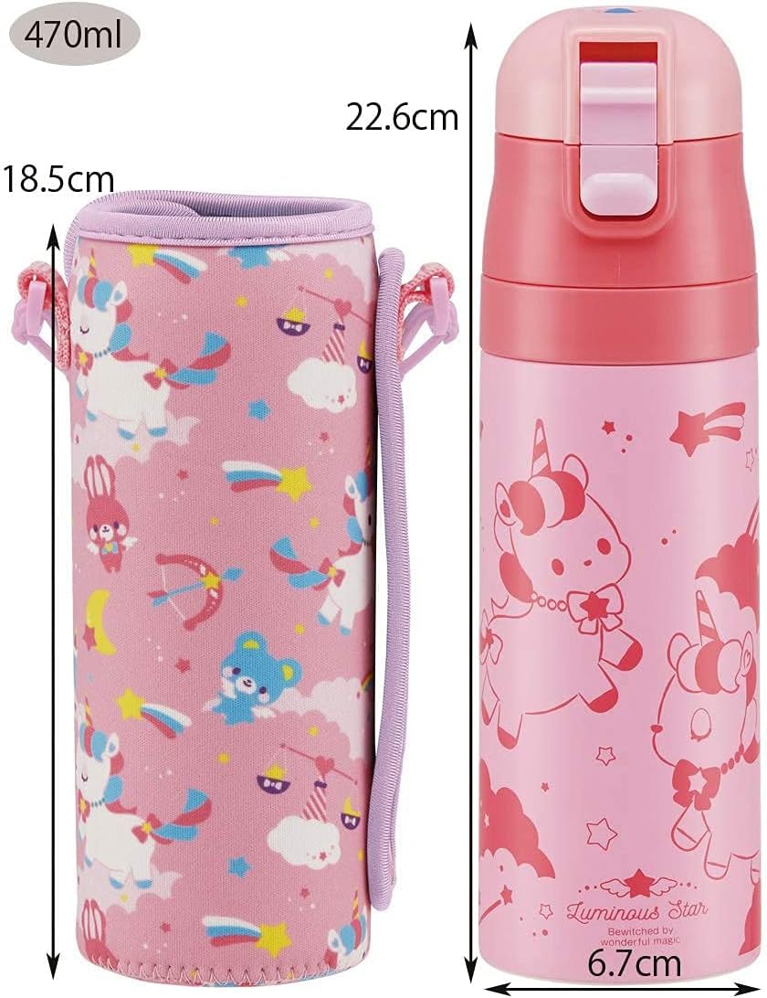 Double layer vacuum thermos construction with high cold retention, lightweight and compact, insulated water bottle Direct drinking type cap unit instantly opens with one touch. Since it can be directly drinked, hot drinks are dangerous, please use it only for cold water. Comes with a bottle cover, so it is shock-resistant and comes with a hand holder for easy carrying. Cap lock design to prevent the cap from falling back Comes with a locking function for easy carrying. Wide diameter for easy insertion of ice Shoulder belt and nameplate included for easy carrying by children. Water bottle cover can also be used with 16.9 fl oz (500 ml) plastic bottles.