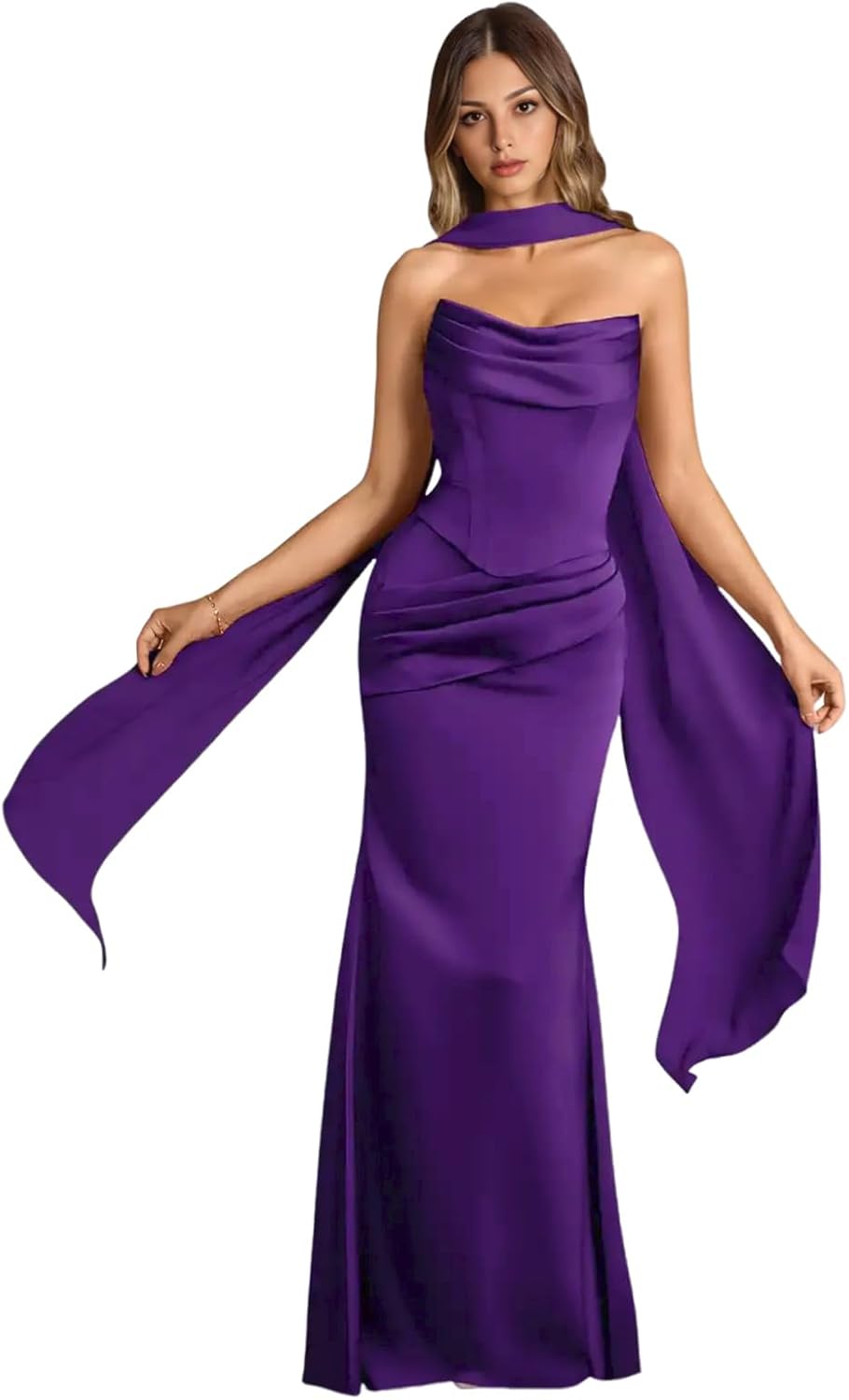 Strapless Bridesmaid Dresses with Scarf Convertible Long Mermaid Ruched Satin Formal Evening Ball Gown for Women Standard Size US2 Bust: 32.5"---Waist: 25.5"---Hips: 35.75" US4 Bust: 33.5"---Waist: 26.5"---Hips: 36.75" US6 Bust: 34.5"---Waist: 27.5"---Hips: 37.5" US8 Bust: 35.5"---Waist: 28.5"---Hips: 38.75" US10 Bust: 36.5"--Waist: 29.5"---Hips: 39.75" US12 Bust: 38"----Waist: 31"-----Hips: 41.25" US14 Bust: 39.5"--Waist: 32.5"---Hips: 42.75" US16 Bust: 41"--Waist: 34"---Hips: 44.25" US16W Bust: 43"---Waist: 36.25"------Hips: 45.5" US18W Bust: 45"---Waist: 38.5"---Hips: 47.5" US20W Bust: 47"---Waist: 40.75"----Hips: 49.5" US22W Bust: 49"---Waist: 43"----Hips: 51.5" US24W Bust: 51"---Waist: 45.25"----Hips: 53.5" US26W Bust: 53"---Waist: 47.5"----Hips: 55.5" Customized Women's V Neck Chiffon Bridesmaid Dress With Slit Long You Needed:A.Full Bust _____ inch or ___ cm.B.Waist _____ inch or ___ cm. C.Hips _____ inch or ___ cm.D.Height: _____inch or ___ cm.E.Hollow (collarbone) to floor____ inch or ___ cm.F.Shoulder to Shoulder ____ inch or ___ cm.G.The heel of your shoes: _____inch or ___ cm.H.The date you need the dress____.OTHER NOTES:1 .The real color of the item may be slightly different from the pictures shown on website caused by many factors such as brightness of your monitor and light brightness. 2.Please allow slight deviation for the measurement data. You are very welcome to costume dress for any question, we will always be here with you.