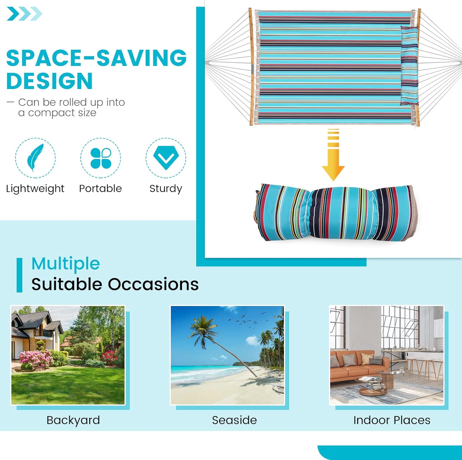 This 2-person hammock is stylish and useful for your outdoor relaxation. With curved bamboo spreader bars, the hammock is super sturdy and not easy to tip over. And tough cotton ropes make the hammock hang with higher stability. Moreover, the hammock is quite comfortable for you to lie, as it’s equipped with padded fabric and a soft head pillow. When finishing using, you can roll up the hammock into a much smaller size, which space-saving for storage and convenient for carrying. If you are looking for a functional and comfortable hammock, this 2-person hammock will be perfect for you.