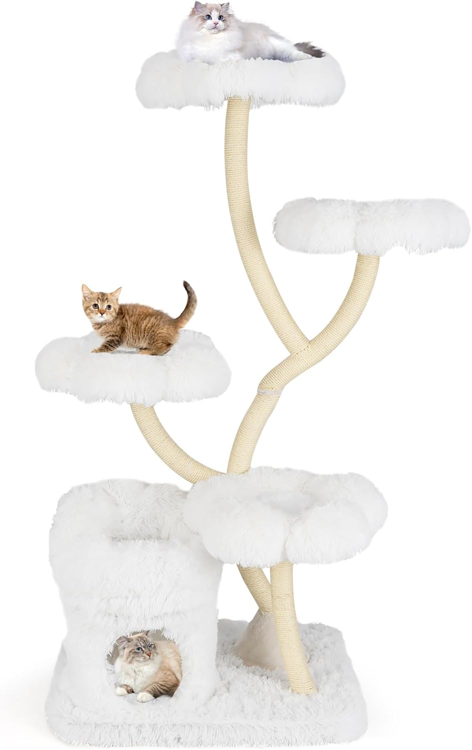 DescriptionTreat your beloved pets to our cat tower, where they can scratch, play, and relax in their personal playground—a delightful addition to any cat owner's home. This cat tree comes with 4 chic flower-shaped platforms for your cats to play and explore. The padded cat condo offers a soft space for relaxation while the upholstered top adds an extra level of comfort. Moreover, the sisal-covered scratching posts not only entice the natural scratching instincts of cats but also help keep their claws healthy and sharp. The stability is further enhanced by a robust base and metal supporting pipes. Elevate your feline companion’s domain with this cat tree!FeatureMulti-layer configuration caters to cat’s climbing, scratching, and resting needs4 soft platforms provide comfy resting spots for your furry companionsProvide your cat with a private retreat within the padded cat condoCrafted with plush fabric for superior comfort and skin-friendly touchFully wrapped sisal scratching posts to satisfy scratching instinct with easeHeavy-duty metal tubing inside provides great supportUnique flower-shaped design adds highlight to your homeEnlarged thickened base is not easy to wobble and tipping overAssembly neededSpecificationColor: White/GrayMaterial: Engineered Wood, Plush, MetalOverall Height: 65"Base Dimensions: 29.5" x 22"( L x W)Cat Condo Dimensions: 17" x 17"(Dia x H)Cat Hole Dimensions: 9" x 7.5"(L x W)Flower-shaped Platform Dimensions: 18"Each Tier Load Capacity: 28.5 lbsNet Weight: 70.5 lbsPackage Includes:1 x Cat Tree1 x User Guide