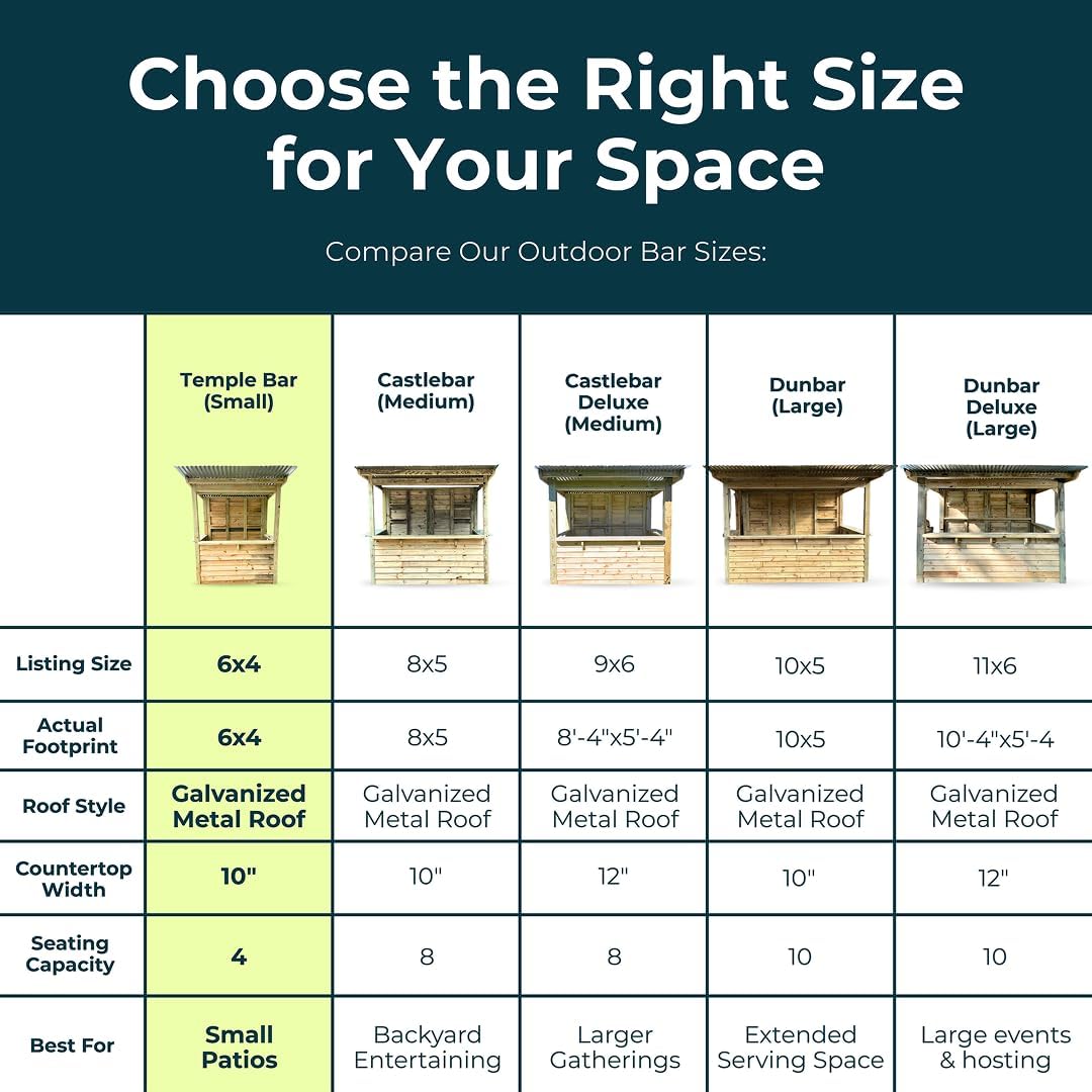 Elevate outdoor entertaining with the Taverns-To-Go 6′ x 4′ Templebar Patio Bar — the perfect mix of craftsmanship, functionality, and social lifestyle. Designed for real living, this bar arrives professionally delivered and assembled, so you can start hosting right away. Crafted with pressure-treated wood and a galvanized steel roof, the Castlebar is built for every season. With generous interior room for fridges and coolers, plus seating for 8+ guests, this bar transforms hardscape into hospitality. Whether you’re pouring drinks at a summer barbecue or watching the big game with friends, the Castlebar makes entertaining effortless and unforgettable.