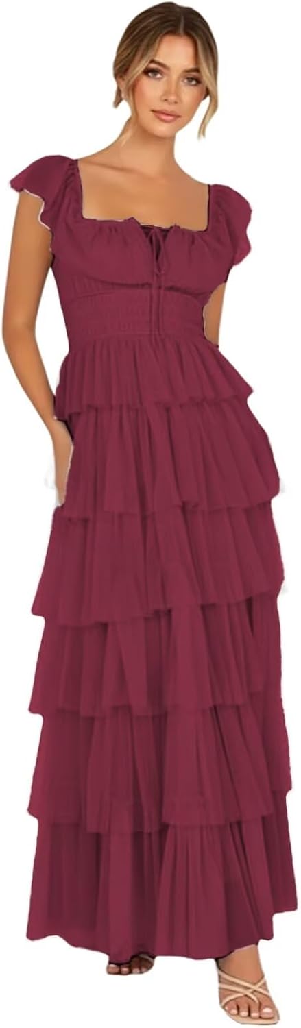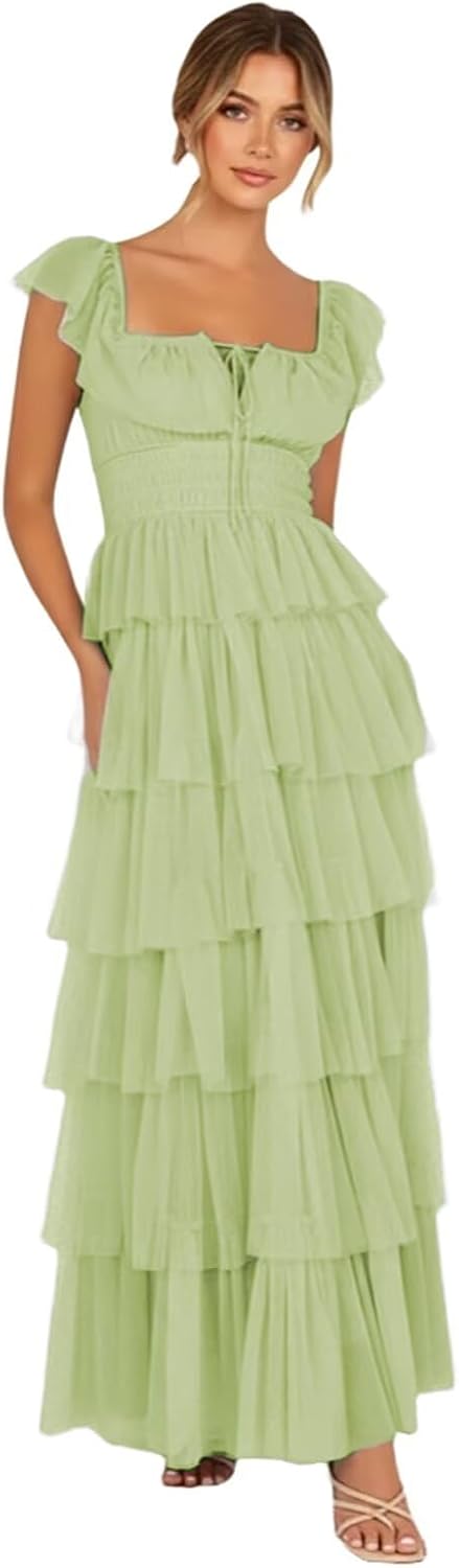 Tiered Tulle Prom Dresses for Women Long Ruffle Square Neck Bridesmaid Dress Spaghetti Straps Evening Gown with Tie Close Product Detailed Introduction: Length: floor length Fabric: tulle Neckline: square neck Sleeves: sleeveless You need customization, please give me your size as follows: 1.: Bust _____ inch or ___ cm 2.: Waist _____ inch or ___ cm 3.: Hips _____ inch or ___ cm 4.: Height: _____inch or ___ cm 5.: The date you need the dress_____