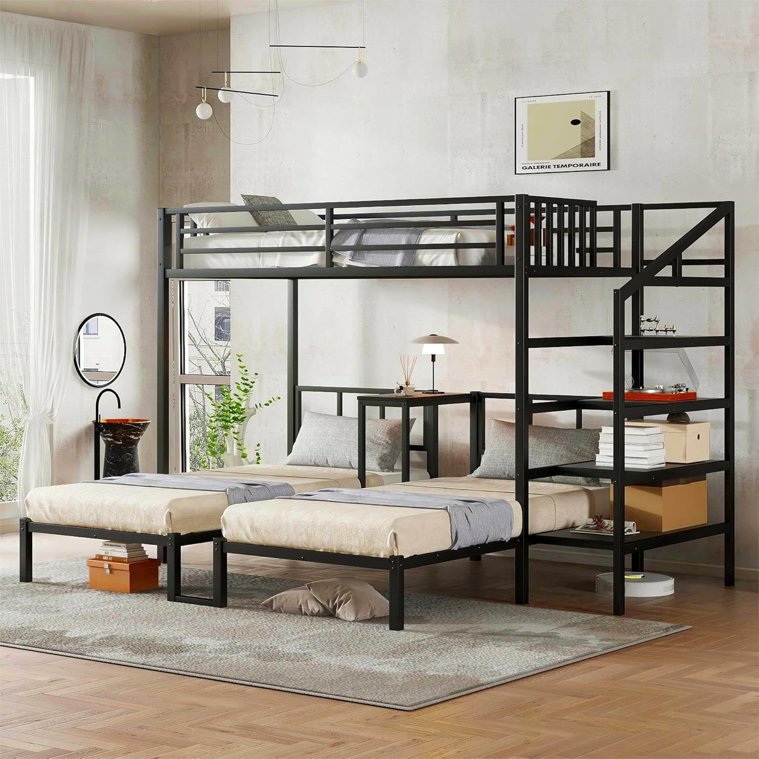 This metal twin over twin & twin bunk bed is an excellent space saver because it can be used for 3 children. It is the perfect solution for extended family, guests, or hosting your child's friends for a sleepover. A shelf on the upper bed can use for storing clothes and other accessories. You can also turn the upper bed into a twin XL bed with this shelf. There is a small table in the middle of the two beds on the lower level, which can be used to place commonly used items or books. I believe that this metal twin over twin & twin bunk bed will bring you a different experience.Weight & DimensionsProduct InformationProduct Type: Metal Triple Bunk BedSize: Twin/Twin/TwinColor: Black/WhiteProduct Material: MetalNotes: All the pictures are taken by actual samples, slight chromatic aberration may occur due to lighting or display.Dimensions and WeightOverall Product Dimension: 92.32'' L x 77.56'' W x 64.4'' HOverall Product Weight: 130.10 LBSNumber of Package: 2Package Dimension: Please refer to the SpecificationMattress and CapacityRecommended Mattress Thickness: 6'' for upper bed, 8'' for bottom bedsWeight Capacity: 250 lbs for upper bed, 350 lbs of each for bottom bedsOther FeaturesBox Spring Required: NoAssembly Required: Yes