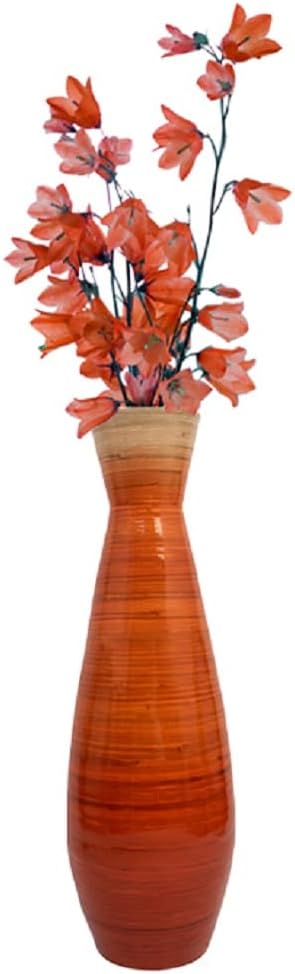 Upgrade your home to a luxury status with this exquisite modern floor vase. The exclusive qualities of this vase, such as vibrant colors, a sturdy design, and subtle hints of natural beauty, will complete the look of any room. Its unique shape and elegant design add a modern appeal to your living room, hallway, dining room, or any room corner. This vase is not only a stunning decorative piece but also incredibly versatile. It looks beautiful on its own, showcasing its vibrant red color that fades into a natural bamboo tone at the top. For an even more striking display, fill it with silk flowers, dried branches, or tall wispy grass to create a captivating arrangement. Crafted from 100% natural bamboo, this vase is designed for long-lasting durability. However, due to its lightweight nature, we recommend adding sand or pebbles to the vase to keep it stable and prevent tipping. Whether you place it in your living room, entryway, dining room, or any other space, this vase will elevate your home decor to the next level. Its elegant and artistic design makes it a perfect addition to any modern home, bringing a touch of sophistication and natural beauty to your interior decor.