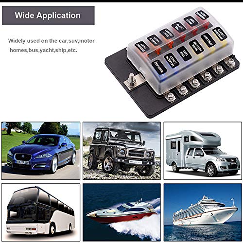Specification:Product Name: Universal Car Blade Fuse Holder Box 12 WayMaterial: PBT body, PC waterproof dirt cover, nickel-plated copper terminals, PPX40 stickerColor: BlackCurrent: 100A input, 30A per circuit outputVoltage: Rated up to 32VProduct Dimensions: 11.5X8.5X3.5cmPart Numbers: CS-579A4Fitment:Fit for cars, boats, RVs, buses, yachts, and more.Suitable for various automotive appliances like roof lamps, headlights, fog lamps, and more.Package Included:Fuse Box x1Sticker x1Self-tapping Screws x420A Fuses x615A Fuses x610A Fuses x65A Fuses x6