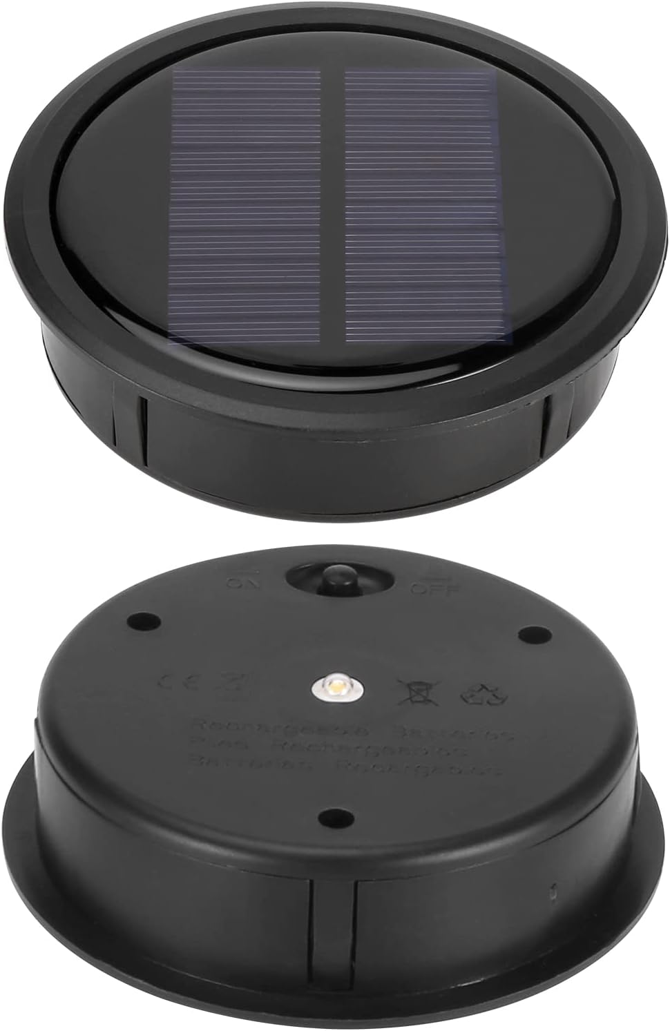 Upgraded 2 pcs 4.13 Inch Warm White LED Solar Light Replacement Top for Round Patio Hanging Lantern, Waterproof Outdoor Hanging Solar Lanterns Replacement TopDescription:- You will receive 2 pcs black solar light replacement tops for most outdoor hanging lanterns, make some warm atmosphere.Great indoor outdoor decor for Christmas/ Halloween/ New Year/ Mother's Day/ Holiday/ Party decoration.- Powered by high conversion solar panel. With 1 bright warm white LED light bead, soft light, not dazzling, let your solar lights provide a romantic lighting for the garden or living room while increase safety during nighttime hours.- The solar light replacement tops are made of sturdy PP plastic, not easy to damage.- IP55 waterproof, can fits for various outdoor weathers. Suitable for garden/ yard/ pathway/ lawn/ walkway etc.- Easy to Operate, On/Off switch up neath the lid, press the switch to ON position when charging. Place them in direct sunlight to fully charge them for 6 - 8 hour, and they can illuminate for up to 8 hours when it is fully charged.- Warm Notice: Make sure the button is in the ON position before change it in the sun.If the button is in ON position, keeping the solar panel in the darkness,then the lights will light up.Specification:Material: PP PlasticShape: RoundColor: BlackLightignt Color: Warm whiteLight Source: 1pc LED lamp beadsPower: 0.1WWaterproof: IP55Size:Outer Diameter about 10.5 cm/ 4.13 inchInner Diameter about 9.5 cm/ 3.74 inchPackage includes:2 pcs x Solar Light Replacement Top