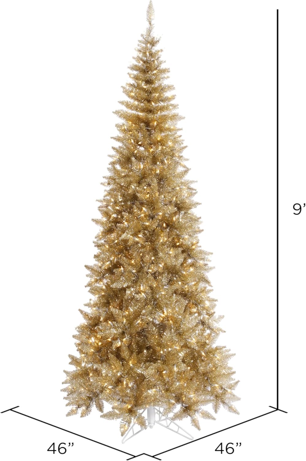 Vickerman 6.5' Champagne Tinsel Fir Slim Artificial Christmas Tree featuring 948 PVC tips and 400 Warm White Dura-lit LED Italian Style lights on grey wire. An elegant alternative to the traditional green Christmas tree, this brilliant tree comes prelit with Warm White Dura-lit LED Mini Lights, has rich colored PVC tips on metal hinged branches, an On/Off Step Switch, and a metal tree stand is included. For additional complimentary accents see the many wreaths and garlands available from Vickerman. This durable tree is maintenance free and will suit any decor. Vickerman has been an industry leader since 1940. Enjoy this expert designed seasonal tree around your home.