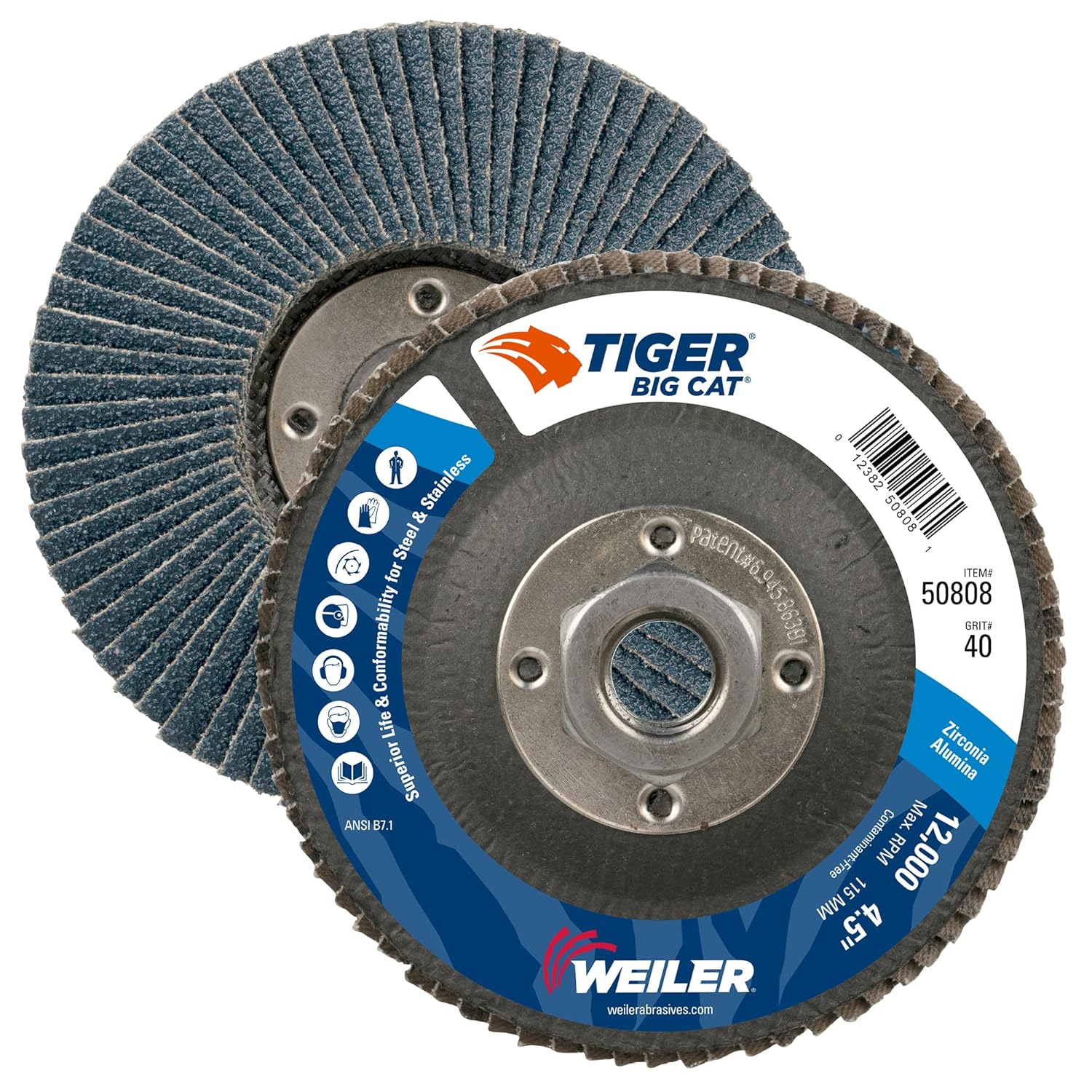 Weiler’s products are also available in small intermediate pack quantities for easy refill. This minimizes the handling from your storage location all the way to the end-user. Our products come the way you need them, ready to load into vending machines. Our vending program drives cost out of the supply chain for our business partners by simplifying the vending process. A Thicker Disc with Larger Flaps Which Conforms to Curved and Irregular Surfaces. Produces a Consistent Finish, 30-40 Percent Longer Life Than Standard Flap Discs. Increased conformability and maximum life.Made in excellent material that makes it more durable and efficient. Suitable for Right Angle Grinder. Made in Stainless Steel material application. Can be use with spanner nuts. It has high flap density, and its arbor hole size is 7/8" with 40 Grit and 12000 maximum RPM. Phenolic backing palte material. With the diameter of 4-1/2 inches, has a Zirconia Alumina. Perfectly made in United States of America. Best for Grinding Application.