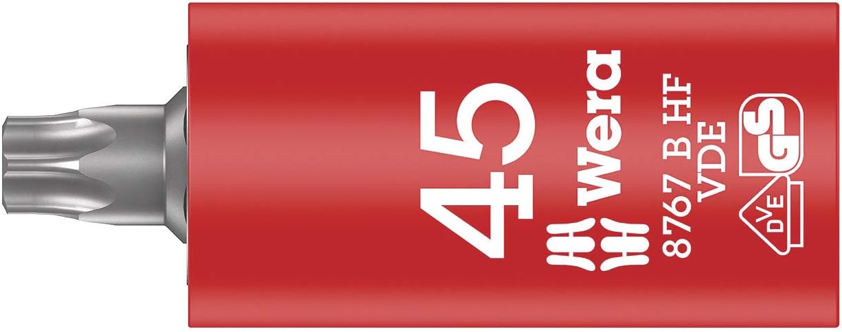 10 Zyklop bit sockets, with ⅜“ drive, insulated, individually tested as per IEC 60900. Increased safety due to 2-component isolation with yellow core under red insulation outer layer visible in case of damage to outer red VDE insulation layer. With holding function for TORX screws to Acument Intellectual Properties specifications or holding function for hexagonal socket screws. Robust textile belt in the typical Wera design with 10 VDE bit sockets in a compact space. A smooth turning mechanism ensures secure holding and easy removal of the sockets. Includes snap hook for attaching to belt loops or bags. With fleece backing and hook and loop fastener strips for easy attachment e. g. on wall, shelf, workshop trolley and Wera 2go tool transport system. VDE ⅜“ bit socket and holding function for particularly comfortable screw driving with reduced risk of screw loss when feeding to the component. With increased safety due to yellow insulation core, which becomes visible in case of damage to the outer red VDE insulation layer. Individually tested tool as per IEC 60900 at 10, 000 V for safe working at the approved voltage of 1, 000 V. Included components: 1x Belt B VDE 1 Zyklop bit socket set TORX /hexagonal socket with holding function, 3/8" drive, 10 pieces; 6x 8767 B VDE HF TORX Zyklop bit socket, insulated, with holding function, 3/8“ drive: TX 20x55. 0, TX 25x55. 0, TX 27x55. 0, TX 30x55. 0, TX 40x55. 0, TX 45x59. 0; 4x 8740 B VDE HF Zyklop bit socket, insulated, with holding function, 3/8“ drive: 4. 0x55. 0, 5. 0x55. 0, 6. 0x55. 0, 8. 0x59. 0; 1x Hook and Loop Fastener Strips 30, 200 x 30 mm.