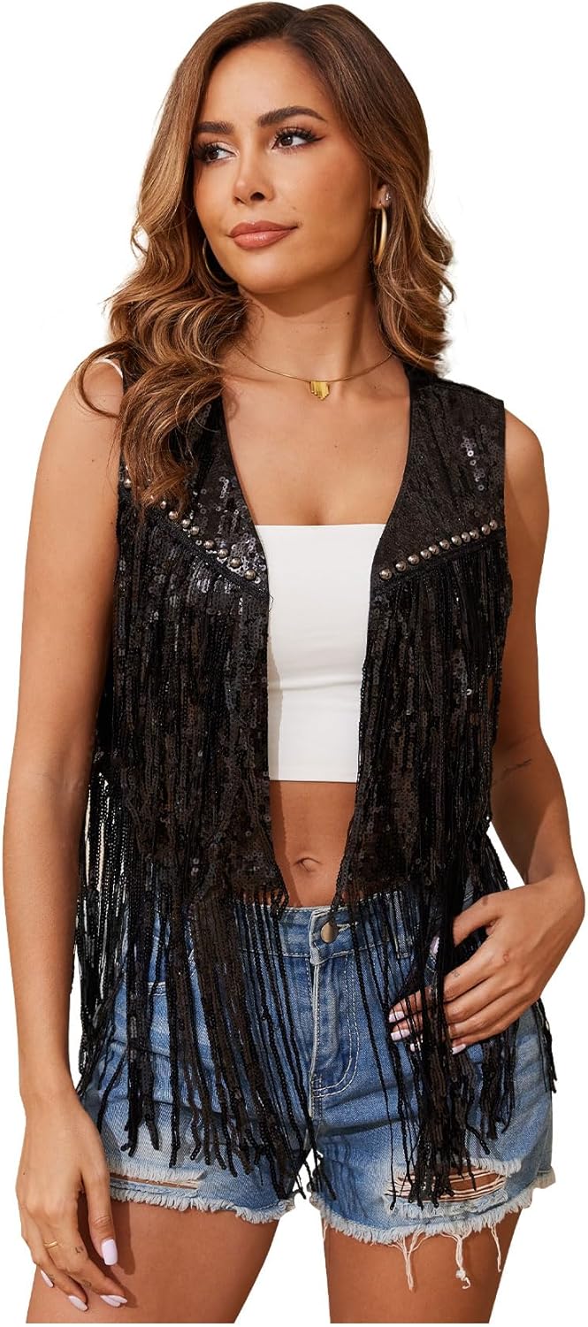 The women sequin sleeveless vest features a unique sequin fringe design. Both the top and hem of the women tassel vest are fringed with sparkling sequins to make you stand out in any occasion. With every step, the tassels of the western sequin vest will swing, making you sparkle.The western sequin vest features a simple placket design that makes it easy to layer with a variety of tops and accessories for a unique personal style. Whether you wear it with jeans, skirts, vests, cowboy boots or a variety of tops, this women sequin sleeveless vest will easily elevate your outfit and add confidence and glamour.Whether you're attending a rave, a 70's retro party, a country concert, or a holiday celebration, the western sequin vest will fit right in and make you stand out from the crowd. The versatility of the women sequin sleeveless vest makes it a year-round fashion must-have, adding a touch of glamour to your look.