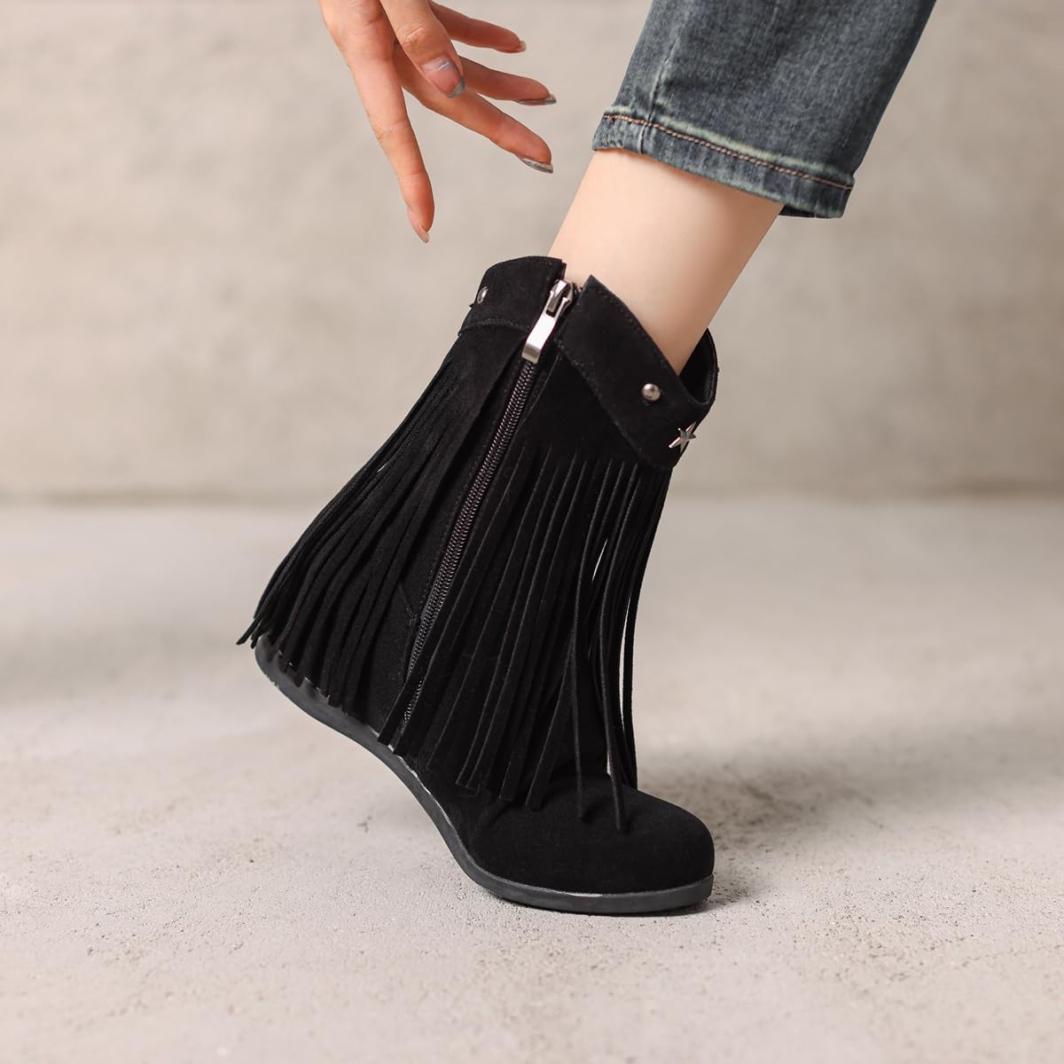 >Women's Cowboy Fringed Ankle Boots Round Toe Zipper Low Wedge Hidden Heels Winter Fall Tassels Cowgirl Short Booties>Size Chart:Size 4 US = EU34 = Heel to Toe 22.0cm/8.66"Size 4.5 US = EU34 =Heel to Toe 22.0cm/8.86"Size 5 US = EU35 = Heel to Toe 22.5cm/9.06"Size 5.5 US = EU36 = Heel to Toe 23cm/9.06"Size 6 US = EU37 = Heel to Toe 23.5cm/9.25"Size 6.5 US = EU37 = Heel to Toe 23.5cm/9.25"Size 7 US = EU38 = Heel to Toe 24cm/9.45"Size 7.5 US = EU39 = Heel to Toe 24.5cm/9.65"Size 8 US = EU39 = Heel to Toe 24.5cm/9.65"Size 8.5 US = EU40 = Heel to Toe 25cm/9.84"Size 9 US = EU41 = Heel to Toe 25.5cm/10.04"Size 9.5 US = EU42 = Heel to Toe 26cm/10.24"Size 10 US = EU42 = Heel to Toe 26cm/10.24"Size 10.5 US = EU43 = Heel to Toe 26.5cm/10.43"Size 11 US = EU44 = Heel to Toe 27.0cm/10.63"Use your length and width measurements to find your shoe size on the above size chart. If your foot is fat or wide, please select a bigger size up.>PERFECT ITEM FEATURES:☛Item Type: Ankle-boots☛Main Material: High Quality Vegan Suede upper; Comfort Velvet Lining; Non-skid Rubber sole.☛Closure_type: Side Zipper☛toe_style: Round-toe☛Heel Height: Heel Height 2.16 inch☛Width: Medium (BM)☛Season: Spring/Autumn/Winter☛Color: Multiple colors optional☛Occasion Lifestyle: Fashion,Classic,Casual.