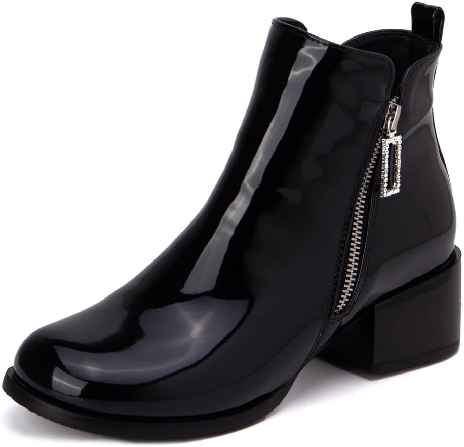 Women's Round Toe Western Chelsea Ankle Boots Side Zipper Chunky Low Heels Patent Leather Dressy Short BootiesSize Chart:Size 4 US = EU34 = Heel to Toe 22.0cm/8.66"Size 4.5 US = EU34 =Heel to Toe 22.0cm/8.86"Size 5 US = EU35 = Heel to Toe 22.5cm/9.06"Size 5.5 US = EU36 = Heel to Toe 23cm/9.06"Size 6 US = EU37 = Heel to Toe 23.5cm/9.25"Size 6.5 US = EU37 = Heel to Toe 23.5cm/9.25"Size 7 US = EU38 = Heel to Toe 24cm/9.45"Size 7.5 US = EU39 = Heel to Toe 24.5cm/9.65"Size 8 US = EU39 = Heel to Toe 24.5cm/9.65"Size 8.5 US = EU40 = Heel to Toe 25cm/9.84"Size 9 US = EU41 = Heel to Toe 25.5cm/10.04"Size 9.5 US = EU42 = Heel to Toe 26cm/10.24"Size 10 US = EU42 = Heel to Toe 26cm/10.24"Size 10.5 US = EU43 = Heel to Toe 26.5cm/10.43"Size 11 US = EU44 = Heel to Toe 27.0cm/10.63"Use your length and width measurements to find your shoe size on the above size chart. If your foot is fat or wide, please select a bigger size up.PERFECT ITEM FEATURES:☛Item Type: Ankle-boots☛Main Material: High Quality Patent Leather upper; Comfort Velvet Lining; Non-skid Rubber sole.☛Closure_type: Side Zipper☛toe_style: Round-toe☛Heel Height: Heel Height 1.57 inch☛Width: Medium (BM)☛Season: Spring/Autumn/Winter☛Color: Multiple colors optional☛Occasion Lifestyle: Fashion,Classic,Casual.
