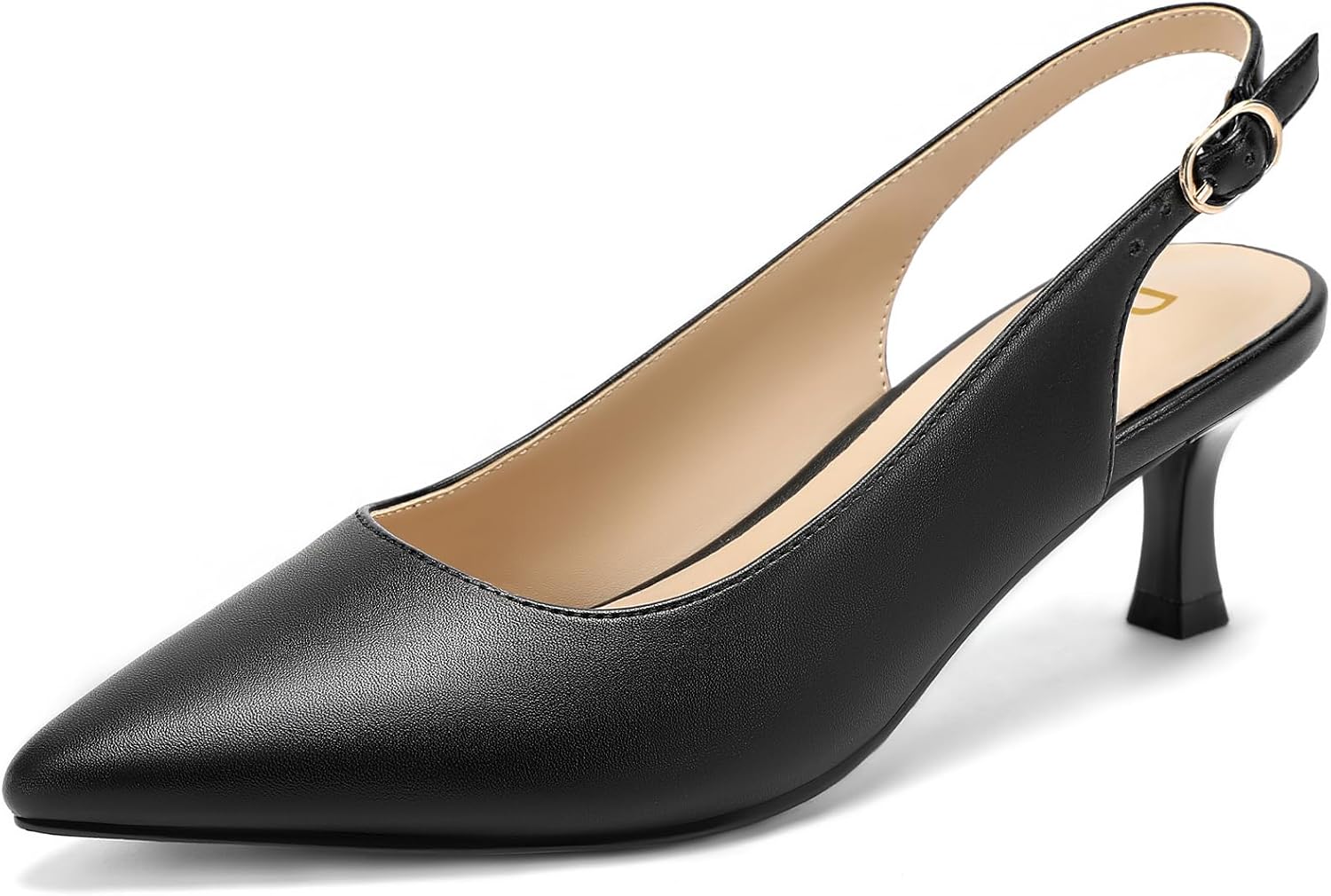 Step into effortless elegance with the DOBOLIN Women's Kitten Heel Slingback Pumps—where timeless style meets everyday comfort. Designed for modern women, these pointed toe dress pumps add a refined touch to any outfit.Elegant Pointed Toe Design: The sleek pointed toe and classic slingback silhouette help elongate the legs and create a sophisticated profile. The adjustable buckle strap allows for a secure and customized fit while maintaining a polished, elegant look.Perfect Kitten Heel Height: Featuring a comfortable 2.3 inch kitten heel, these slingback pumps provide a graceful lift while remaining easy to walk in. Enjoy the perfect balance of style and comfort for long days at the office or special occasions.Classic Colors & True-to-Size Fit: Available in timeless Black, Nude, White, and Navy, these women's dress pumps easily match a variety of outfits. Designed with a true-to-size fit to help you find your perfect pair with confidence.Versatile for Any Occasion: These elegant women's kitten heels pair perfectly with dresses, skirts, jeans, or office wear. Ideal for weddings, work, parties, formal events, and everyday outings.With DOBOLIN, you never have to compromise between comfort and style. These slingback kitten heel pumps are designed to keep you looking confident and feeling comfortable wherever the day takes you.