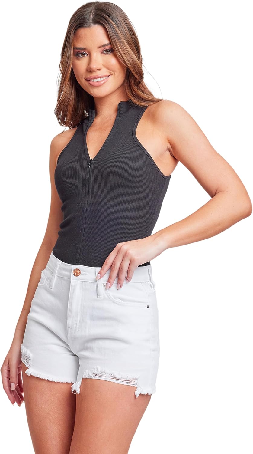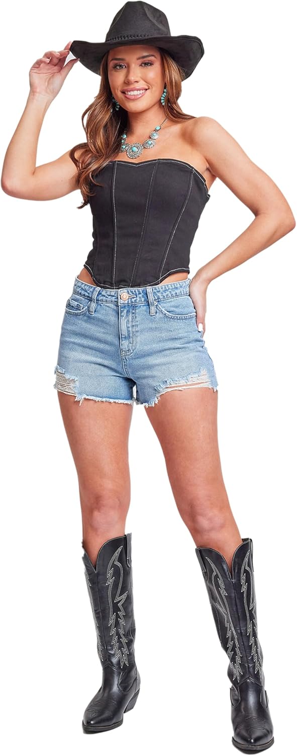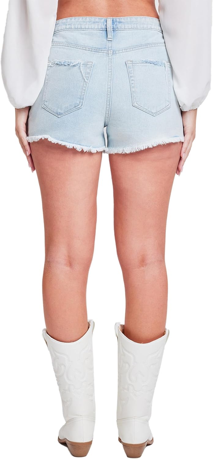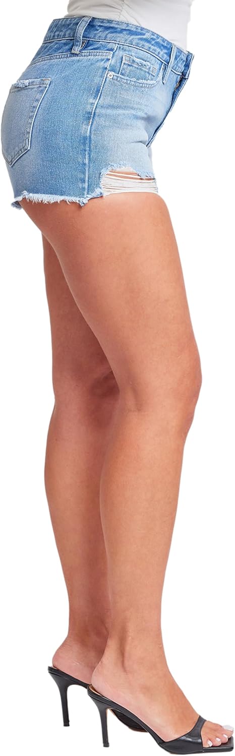 You might be ready for the festival, but they won’t be ready for you in our Women’s High-Rise Festival Shorts. Perfect for any concert or show, these jean shorts feature a slightly longer inseam for that ideal vintage look, and light distressing throughout for that perfect grungy feel. Complete with a high waisted five-pocket construction, cotton denim composition, single-button closure with front zip, ripped detailing, a frayed cutoff hem, and belt loops. Due to the nature of the novelty wash process and hand-crafted design, each garment will have a unique appearance – your pair will be unique to you! Style with your favorite band tee and leather boots to finish the Rock and Roll aesthetic. Product Details: - High Rise - Single-button closure with Zipper - 5-Pocket Construction - Belt Loops - Frayed Hems Size & Fit (Based on size 5) - Inseam (Frayed): 3” - Rise (To top edge of band): 11” - Leg Opening: 24” - Model is wearing a size 3 Machine wash cold. Separately inside out. Tumble dry low. 100% Cotton (Color: 2629J)